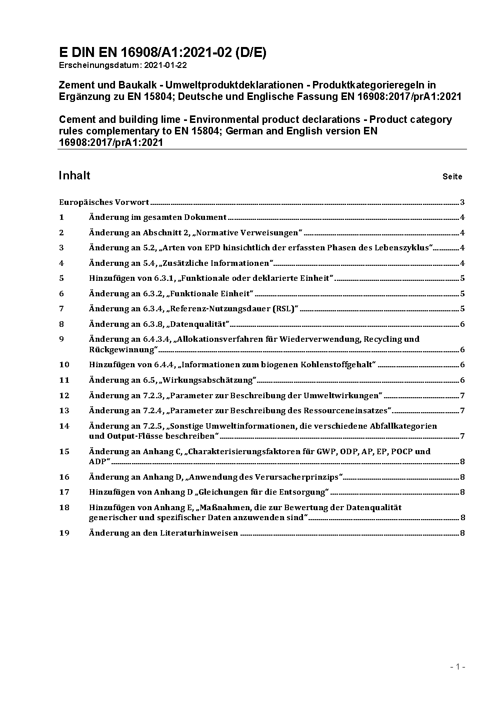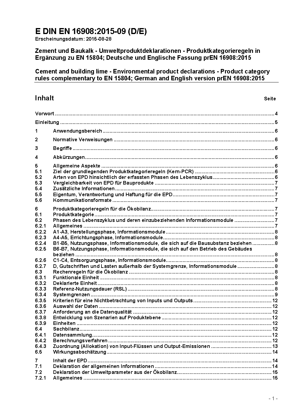 Zement und Baukalk - Umweltproduktdeklarationen - Produktkategorieregeln in Ergänzung zu EN 15804; Deutsche und Englische Fassung prEN 16908:2015
