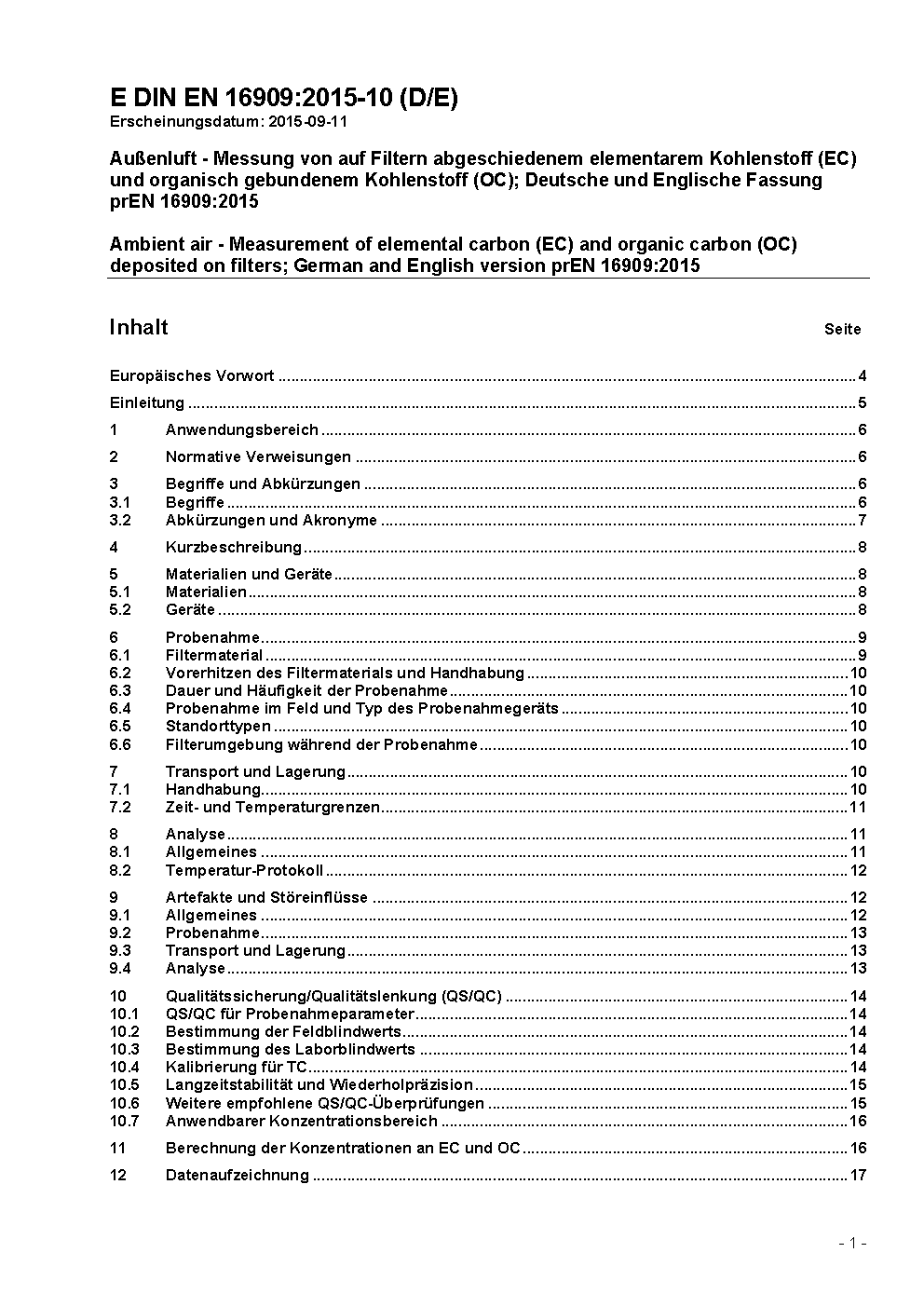 Außenluft - Messung von auf Filtern gesammeltem elementarem Kohlenstoff (EC) und organisch gebundenem Kohlenstoff (OC); Deutsche Fassung EN 16909:2017