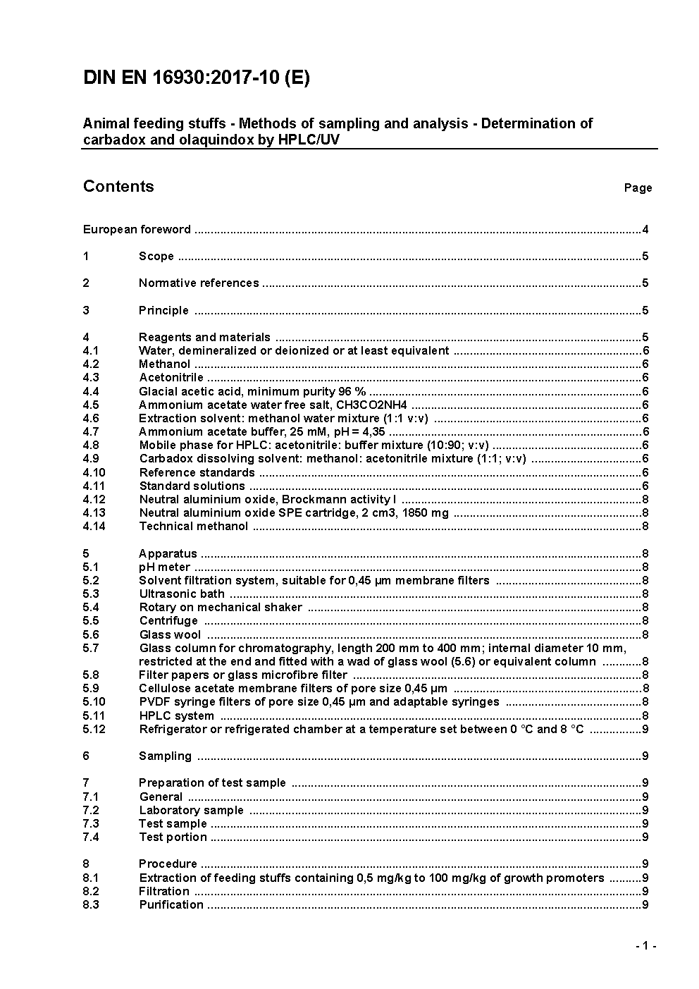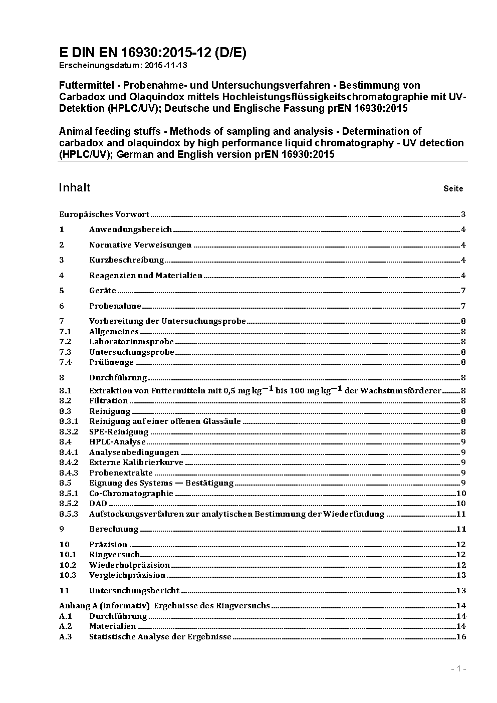 Futtermittel - Probenahme- und Untersuchungsverfahren - Bestimmung von Carbadox und Olaquindox mittels Hochleistungsflüssigkeitschromatographie mit UV-Detektion (HPLC/UV); Deutsche und Englische Fassung prEN 16930:2015