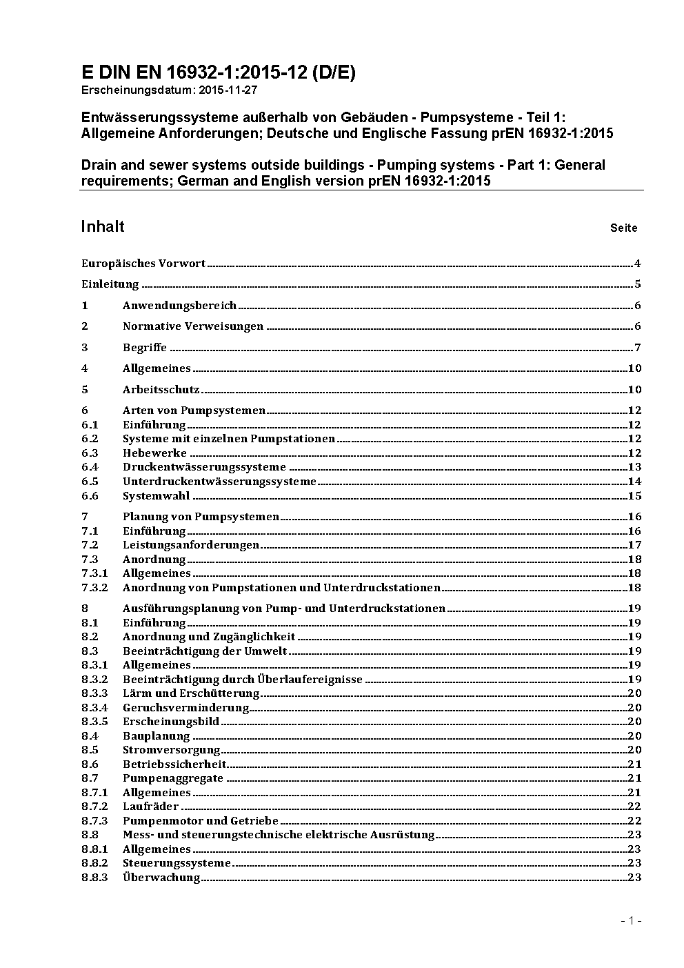 Entwässerungssysteme außerhalb von Gebäuden - Pumpsysteme - Teil 1: Allgemeine Anforderungen; Deutsche Fassung EN 16932-1:2018