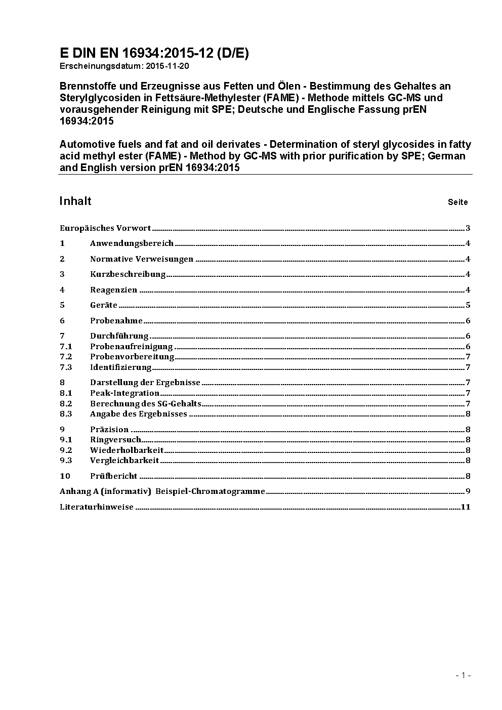 Kraftstoffe und Erzeugnisse aus Fetten und Ölen - Bestimmung des Gehaltes an Sterylglycosiden in Fettsäure-Methylester (FAME) - Verfahren mittels GC-MS und vorausgehender Reinigung mit SPE; Deutsche Fassung EN 16934:2017