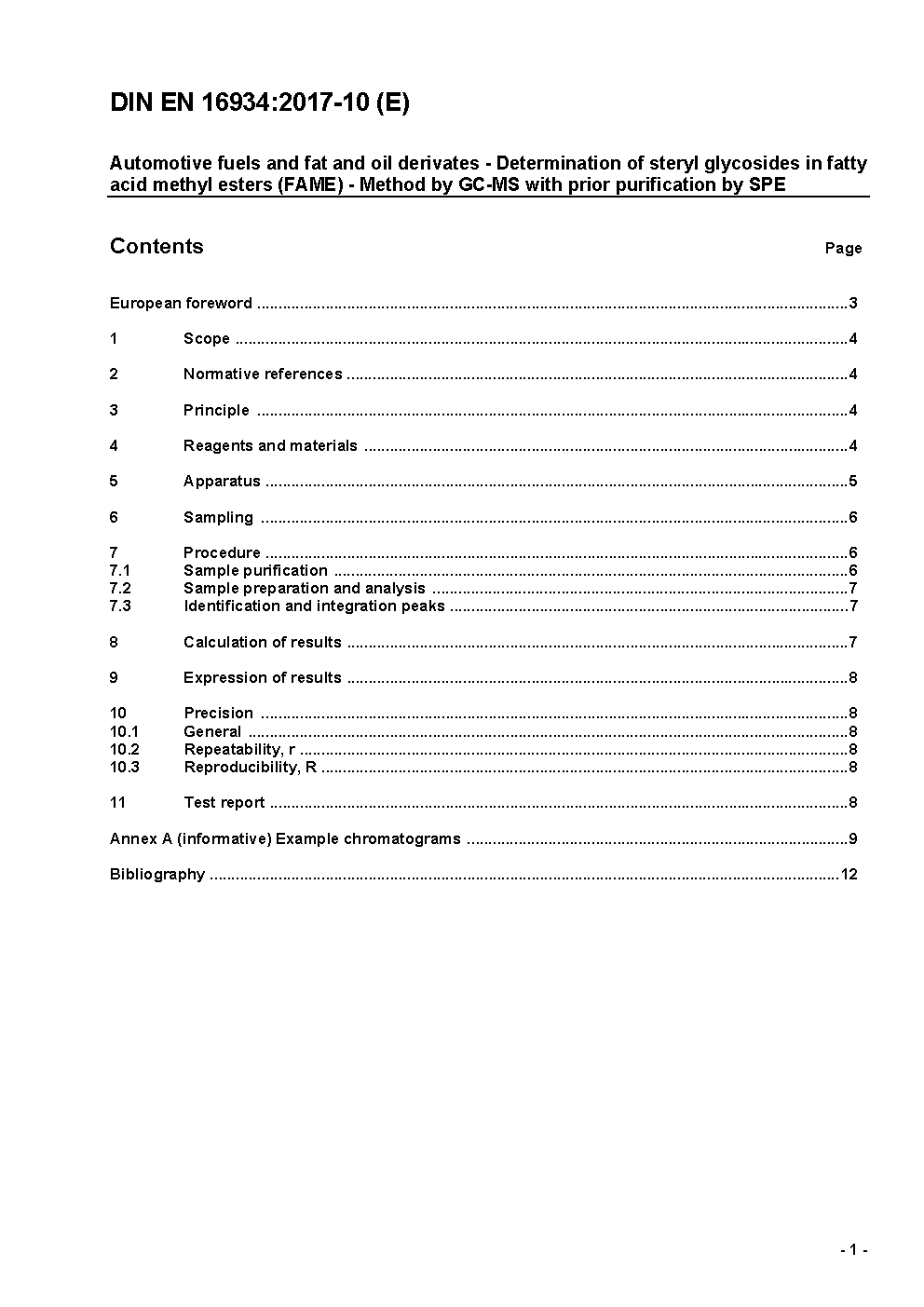 Automotive fuels and fat and oil derivates - Determination of steryl glycosides in fatty acid methyl esters (FAME) - Method by GC-MS with prior purification by SPE; German version EN 16934:2017