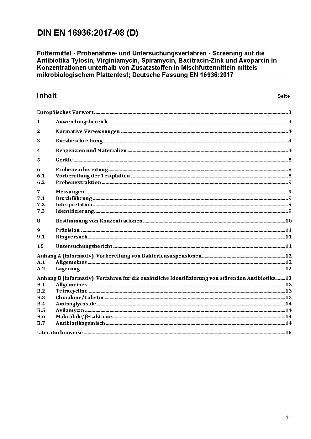 Futtermittel - Probenahme- und Untersuchungsverfahren - Screening auf die Antibiotika Tylosin, Virginiamycin, Spiramycin, Bacitracin-Zink und Avoparcin in Konzentrationen unterhalb von Zusatzstoffen in Mischfuttermitteln mittels mikrobiologischem Plattentest; Deutsche und Englische Fassung prEN 16936:2015