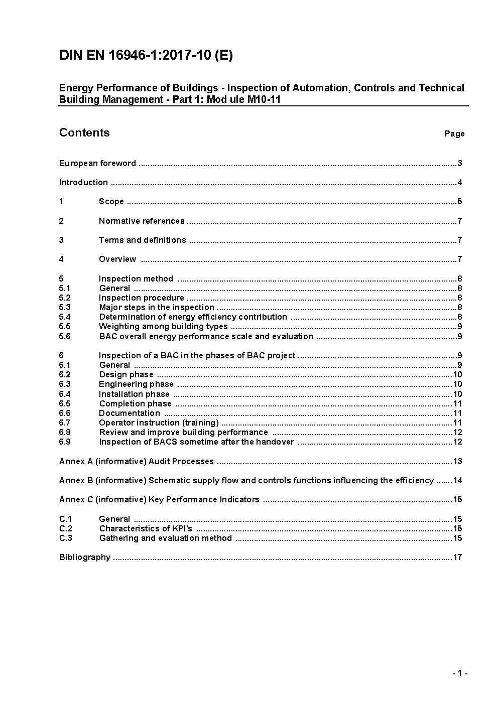 Energy Performance of Buildings - Inspection of Automation, Controls and Technical Building Management - Part 1: Module M10-11; German version EN 16946-1:2017