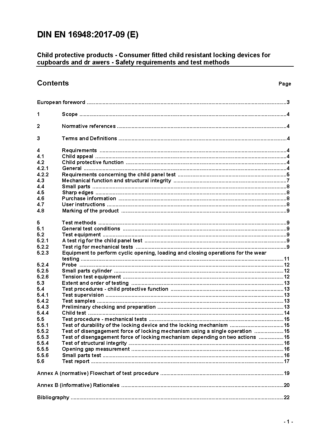 Kindersicherheitsprodukte - Vom Verbraucher angebrachte kindergesicherte Verriegelungsvorrichtungen für Schränke und Schubladen - Sicherheitsanforderungen und Prüfverfahren; Deutsche Fassung EN 16948:2017