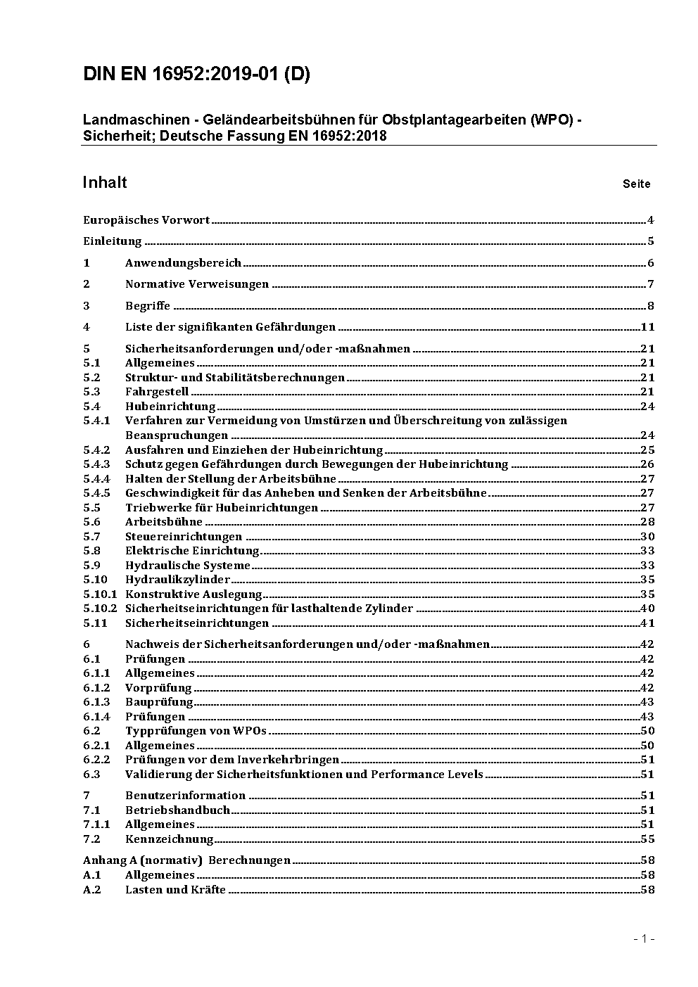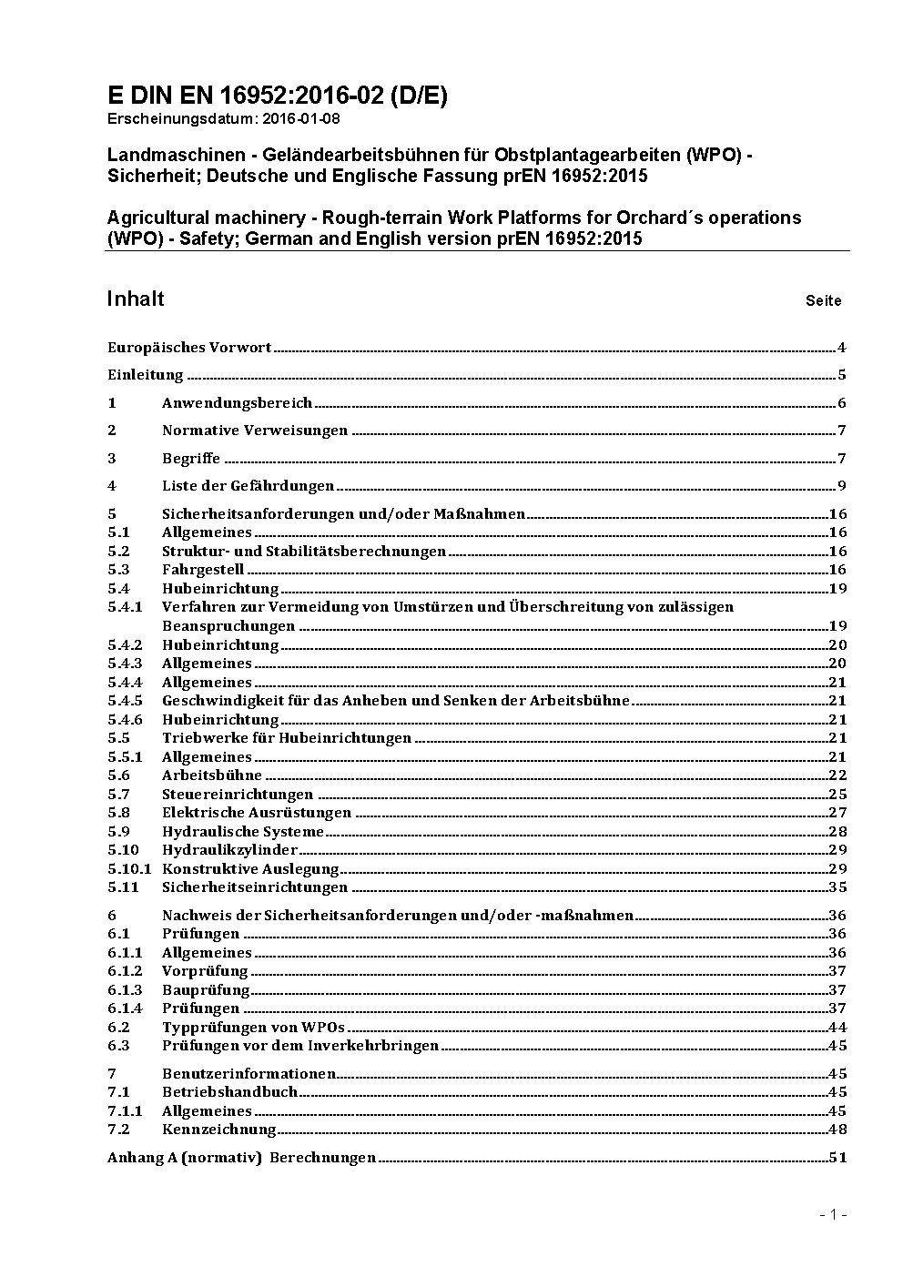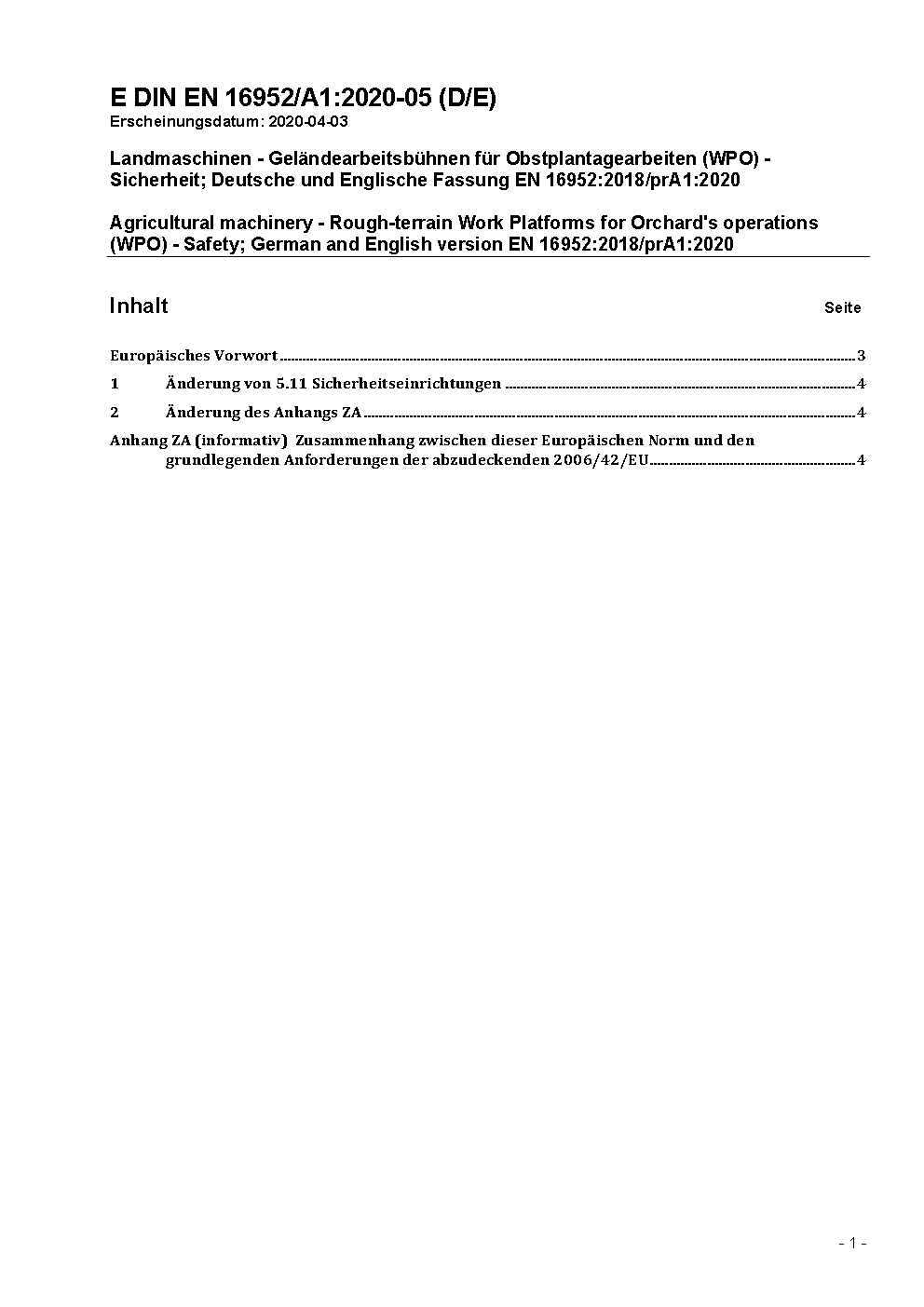 Landmaschinen - Geländearbeitsbühnen für Obstplantagearbeiten (WPO) - Sicherheit; Deutsche und Englische Fassung EN 16952:2018/prA1:2020