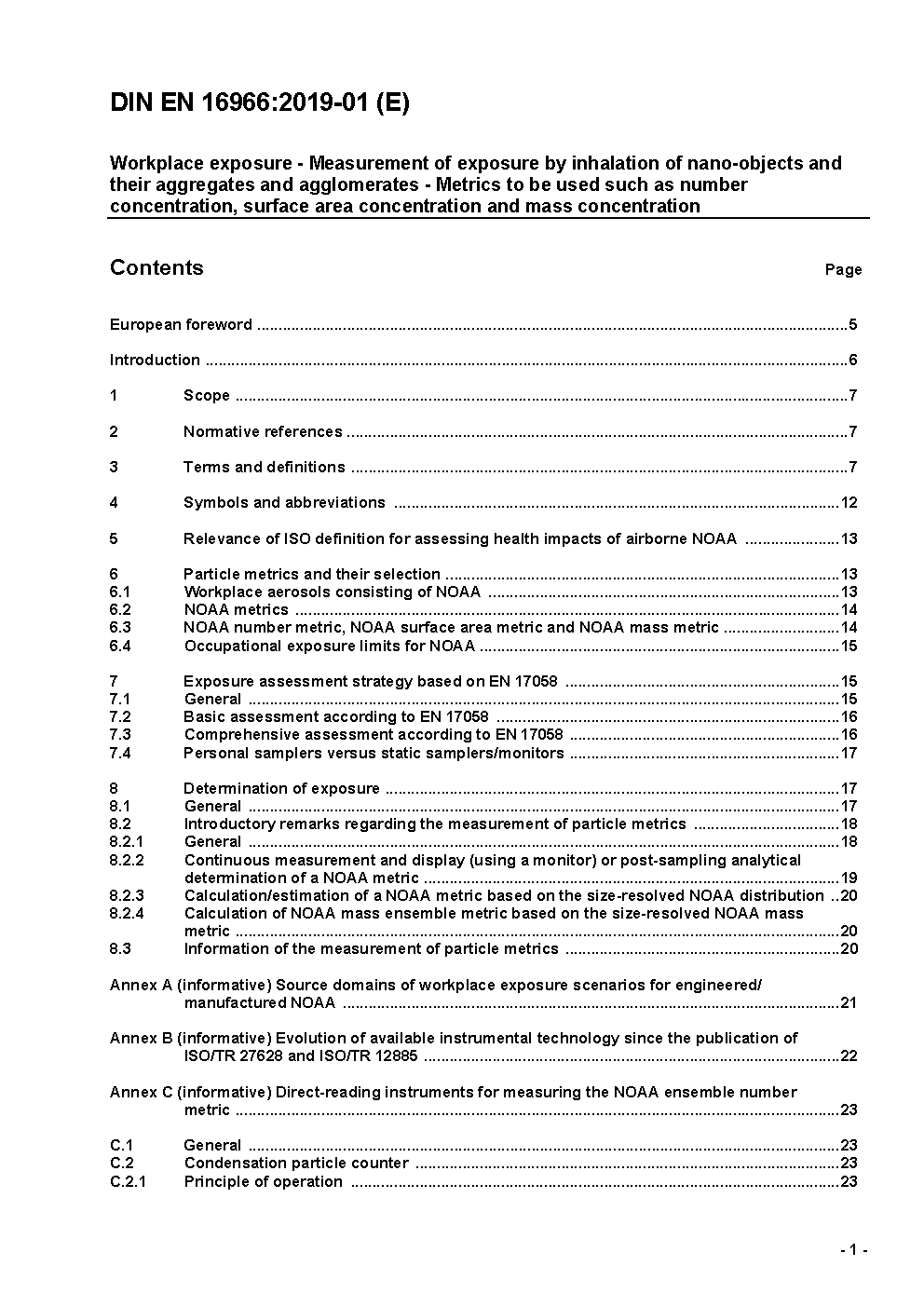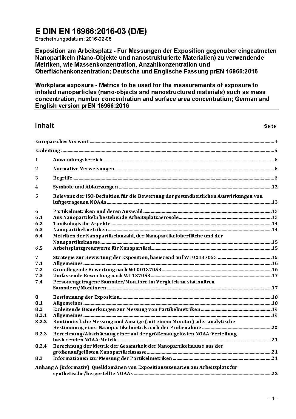 Exposition am Arbeitsplatz - Für Messungen der Exposition gegenüber eingeatmeten Nanopartikeln (Nano-Objekte und nanostrukturierte Materialien) zu verwendende Metriken, wie Massenkonzentration, Anzahlkonzentration und Oberflächenkonzentration; Deutsche und Englische Fassung prEN 16966:2016