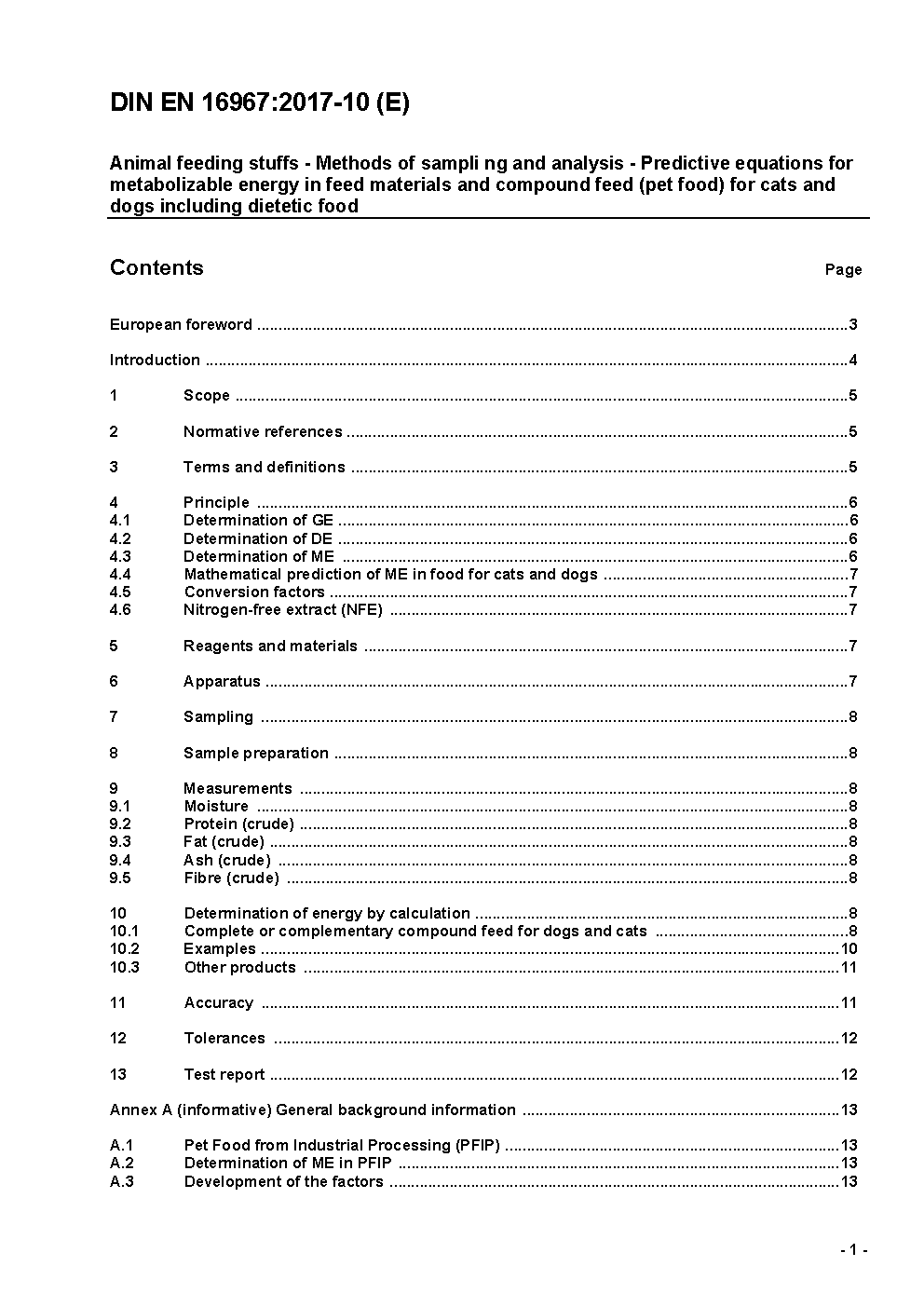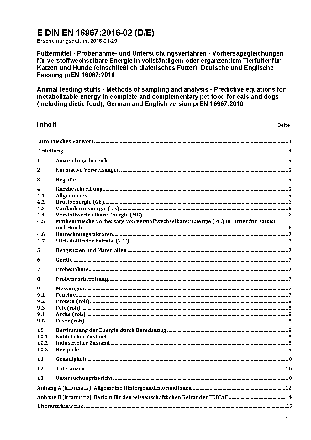 Animal feeding stuffs - Methods of sampling and analysis - Predictive equations for metabolizable energy in feed materials and compound feed (pet food) for cats and dogs including dietetic food; German version EN 16967:2017