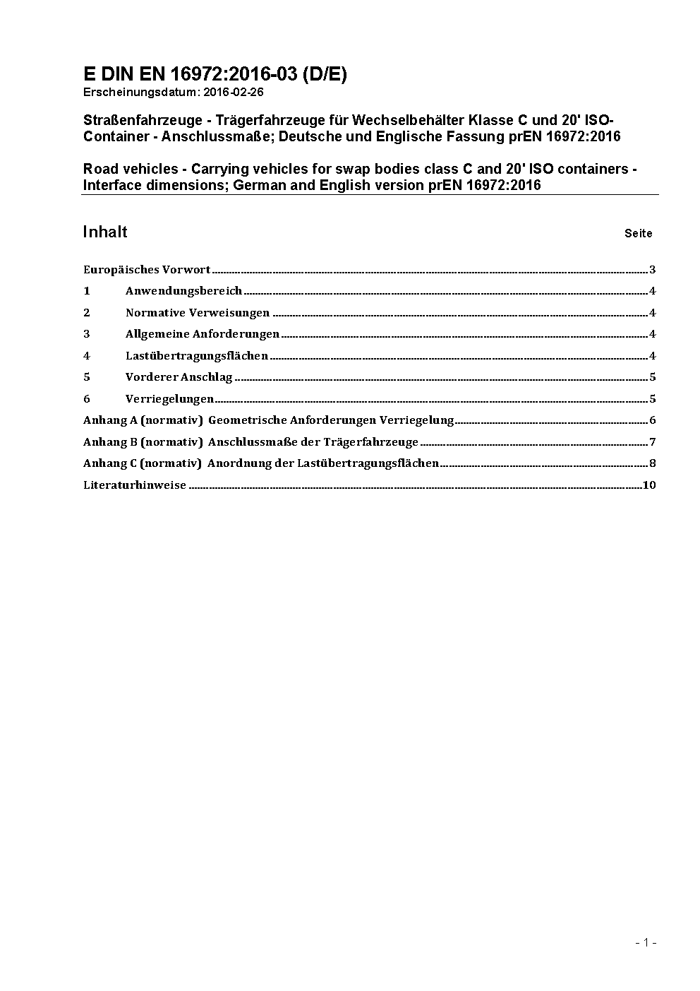 Road vehicles - Carrying vehicles for swap bodies class C and 20' ISO containers - Interface dimensions; German and English version prEN 16972:2016