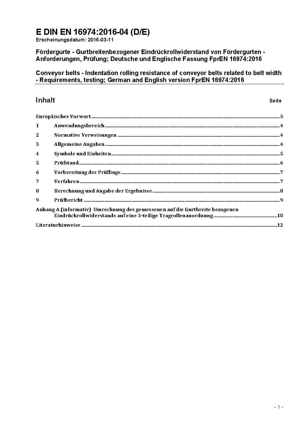 Fördergurte - Gurtbreitenbezogener Eindrückrollwiderstand - Anforderungen, Prüfung; Deutsche Fassung EN 16974:2016