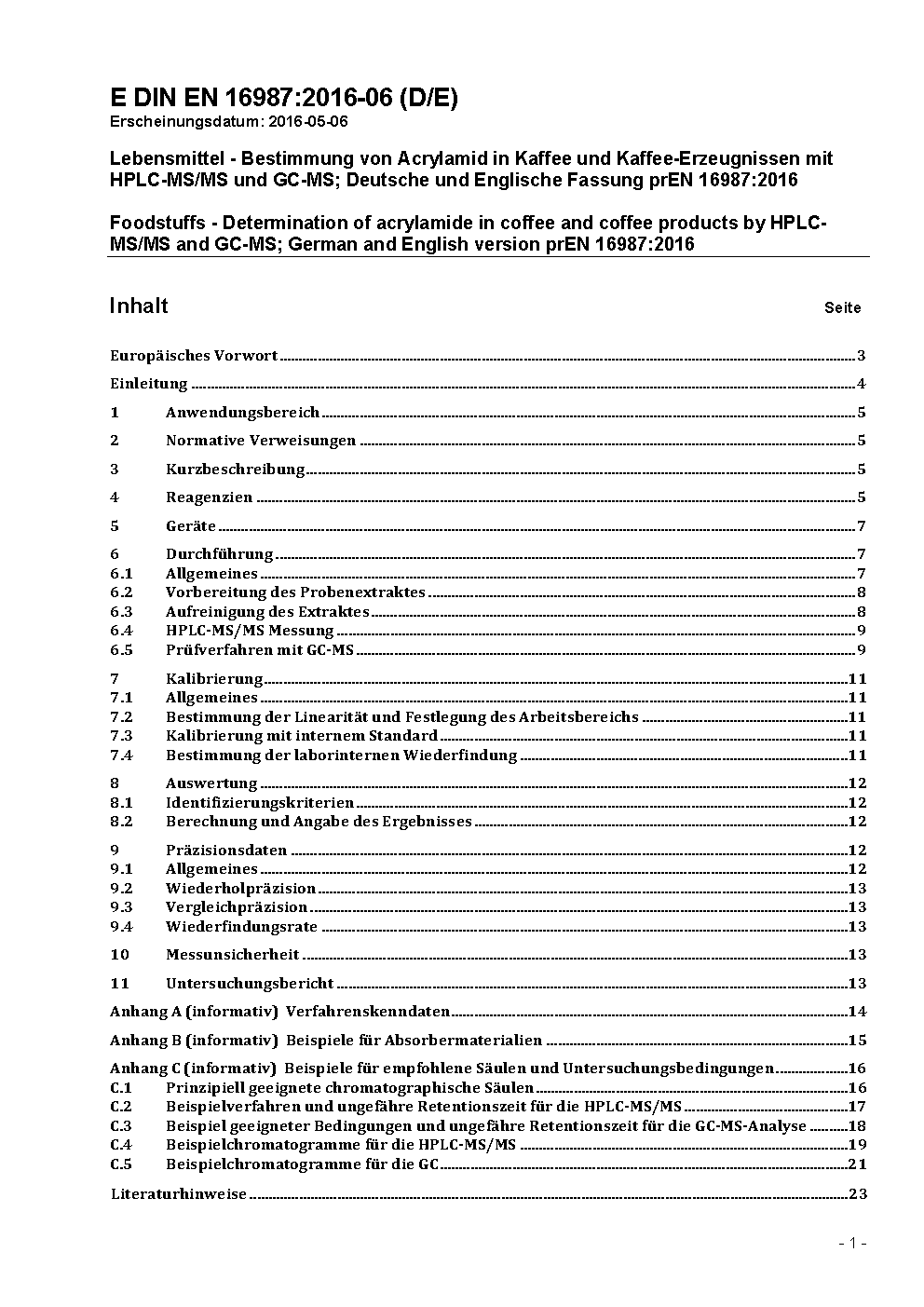Lebensmittel - Bestimmung von Acrylamid in Kaffee und Kaffee-Erzeugnissen mit HPLC-MS/MS und GC-MS; Deutsche und Englische Fassung prEN 16987:2016