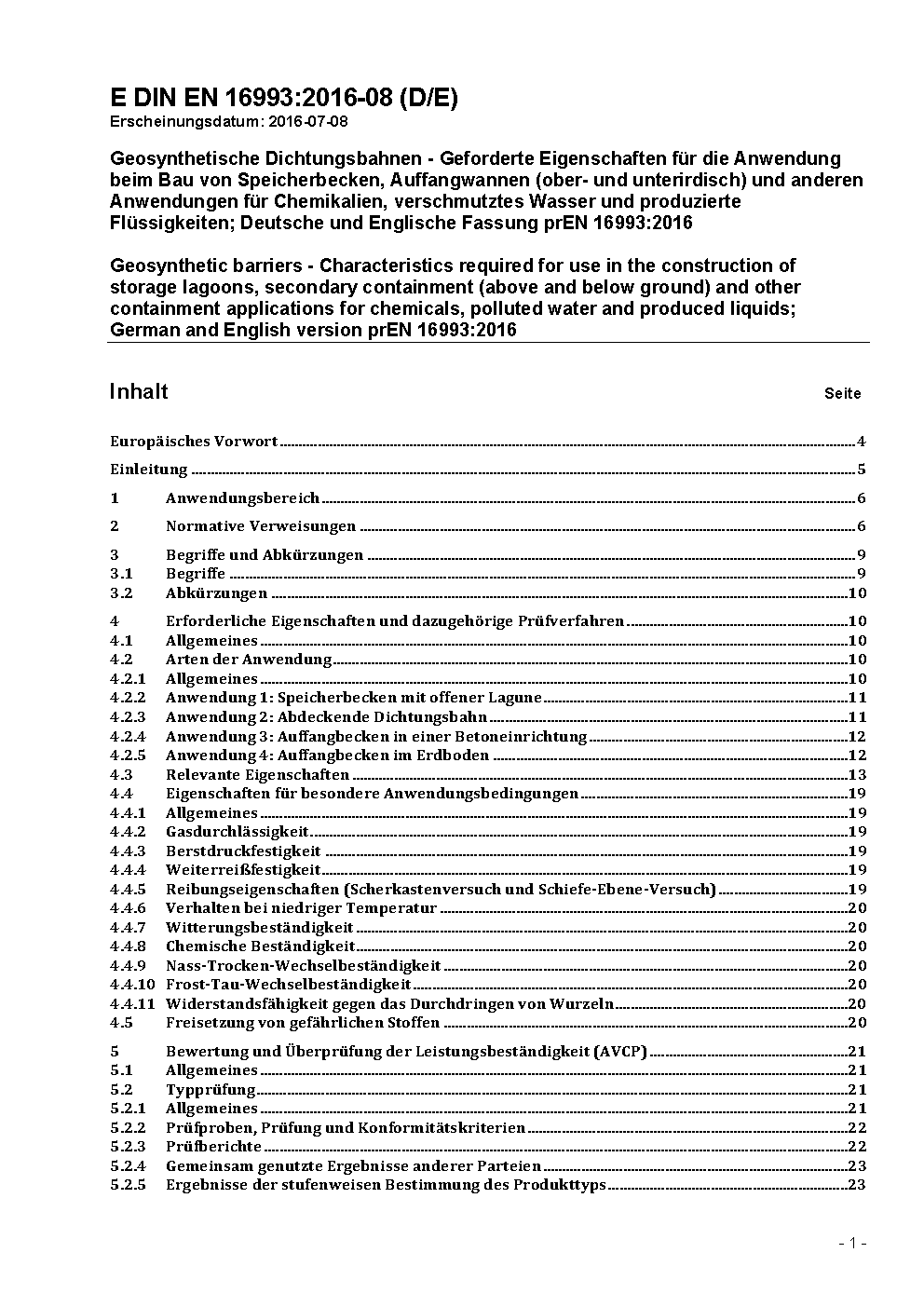 Geosynthetische Dichtungsbahnen - Geforderte Eigenschaften für die Anwendung beim Bau von Speicherbecken, Auffangwannen (ober- und unterirdisch) und anderen Anwendungen für Chemikalien, verschmutztes Wasser und produzierte Flüssigkeiten; Deutsche Fassung EN 16993:2018