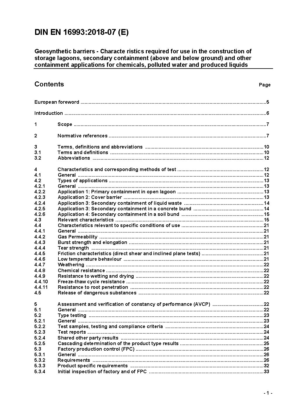 Geosynthetic barriers - Characteristics required for use in the construction of storage lagoons, secondary containment (above and below ground) and other containment applications for chemicals, polluted water and produced liquids; German version EN 16993:2018