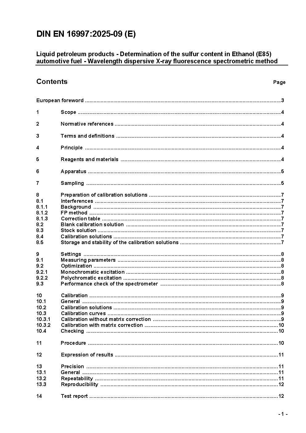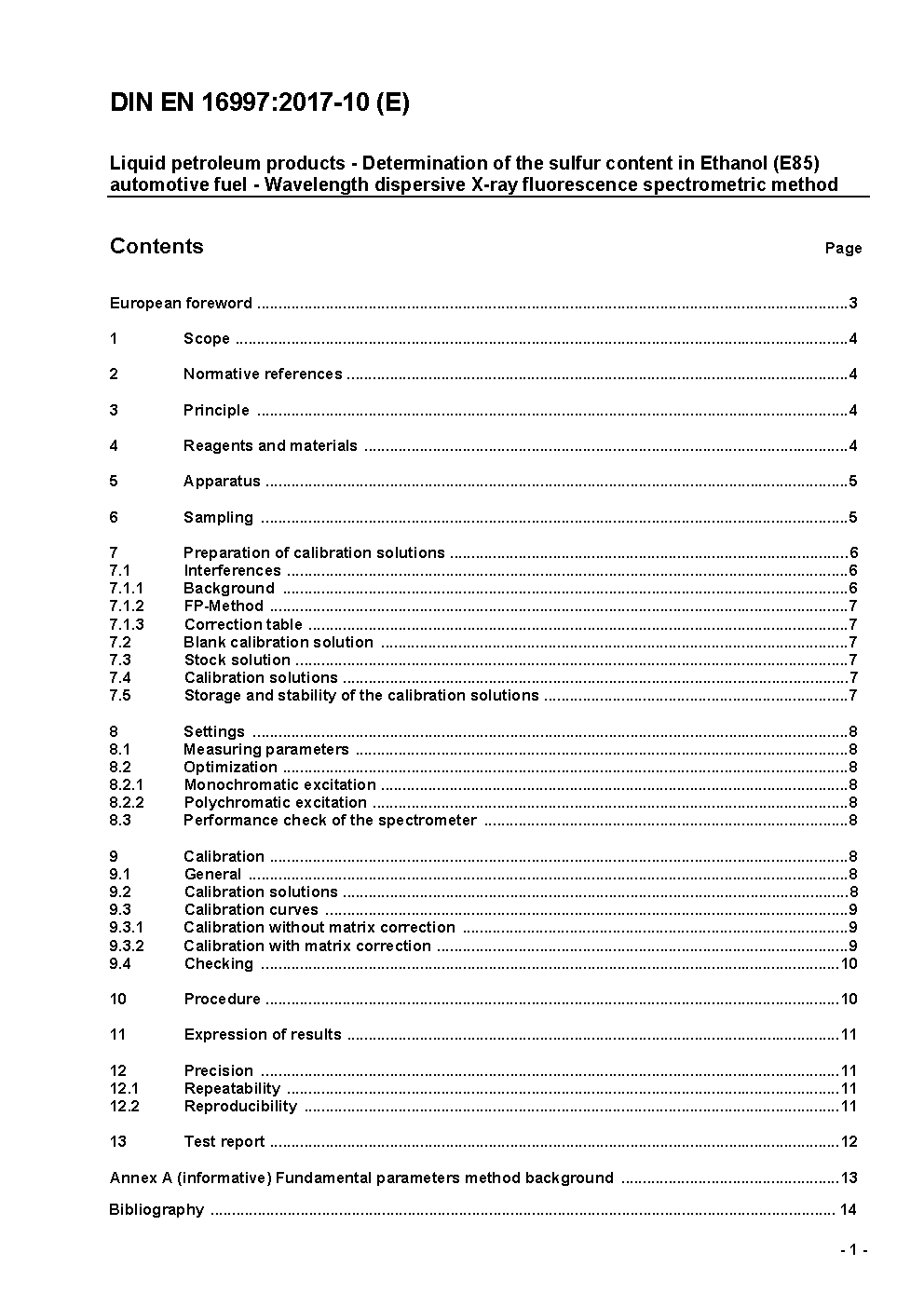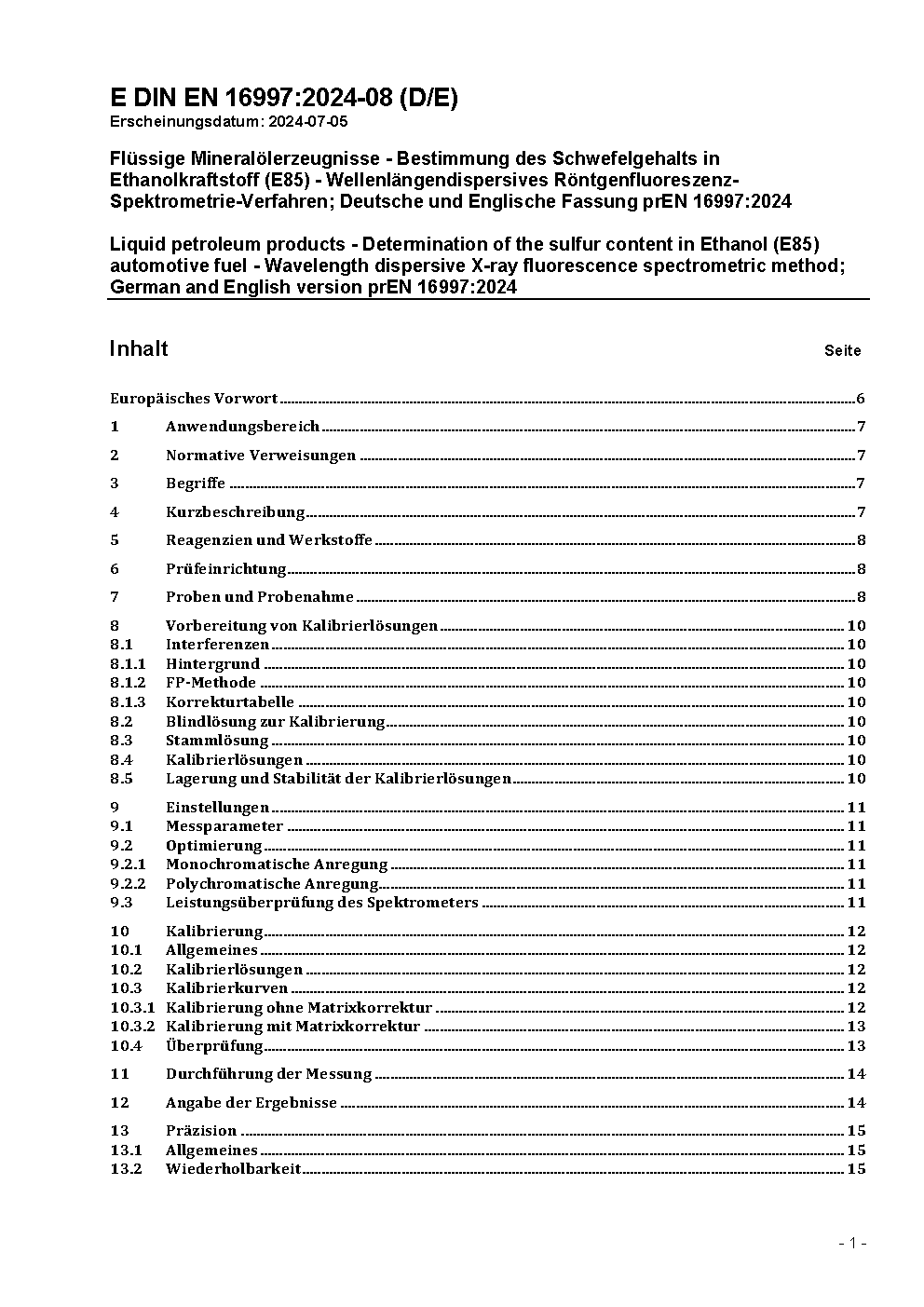 Flüssige Mineralölerzeugnisse - Bestimmung des Schwefelgehalts in Ethanolkraftstoff (E85) - Wellenlängendispersives Röntgenfluoreszenz-Spektrometrie-Verfahren; Deutsche Fassung EN 16997:2017