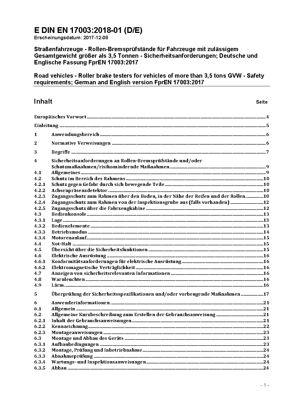 Straßenfahrzeuge - Rollen-Bremsprüfstände für Fahrzeuge mit zulässigem Gesamtgewicht größer als 3,5 Tonnen - Sicherheitsanforderungen; Deutsche und Englische Fassung FprEN 17003:2017