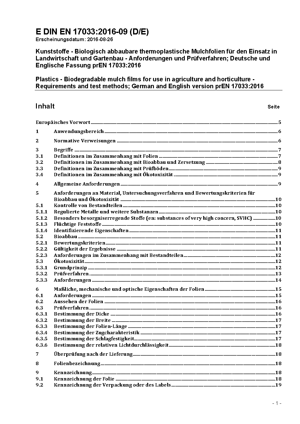 Plastics - Biodegradable mulch films for use in agriculture and horticulture - Requirements and test methods; German version EN 17033:2018