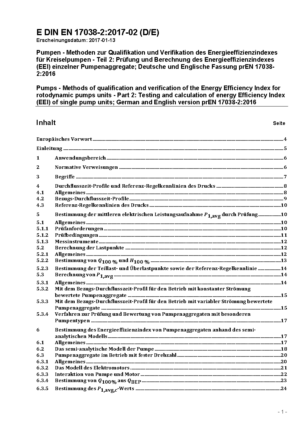 Pumpen - Methoden zur Qualifikation und Verifikation des Energieeffizienzindexes für Kreiselpumpen - Teil 2: Prüfung und Berechnung des Energieeffizienzindexes (EEI) einzelner Pumpenaggregate; Deutsche und Englische Fassung prEN 17038-2:2016