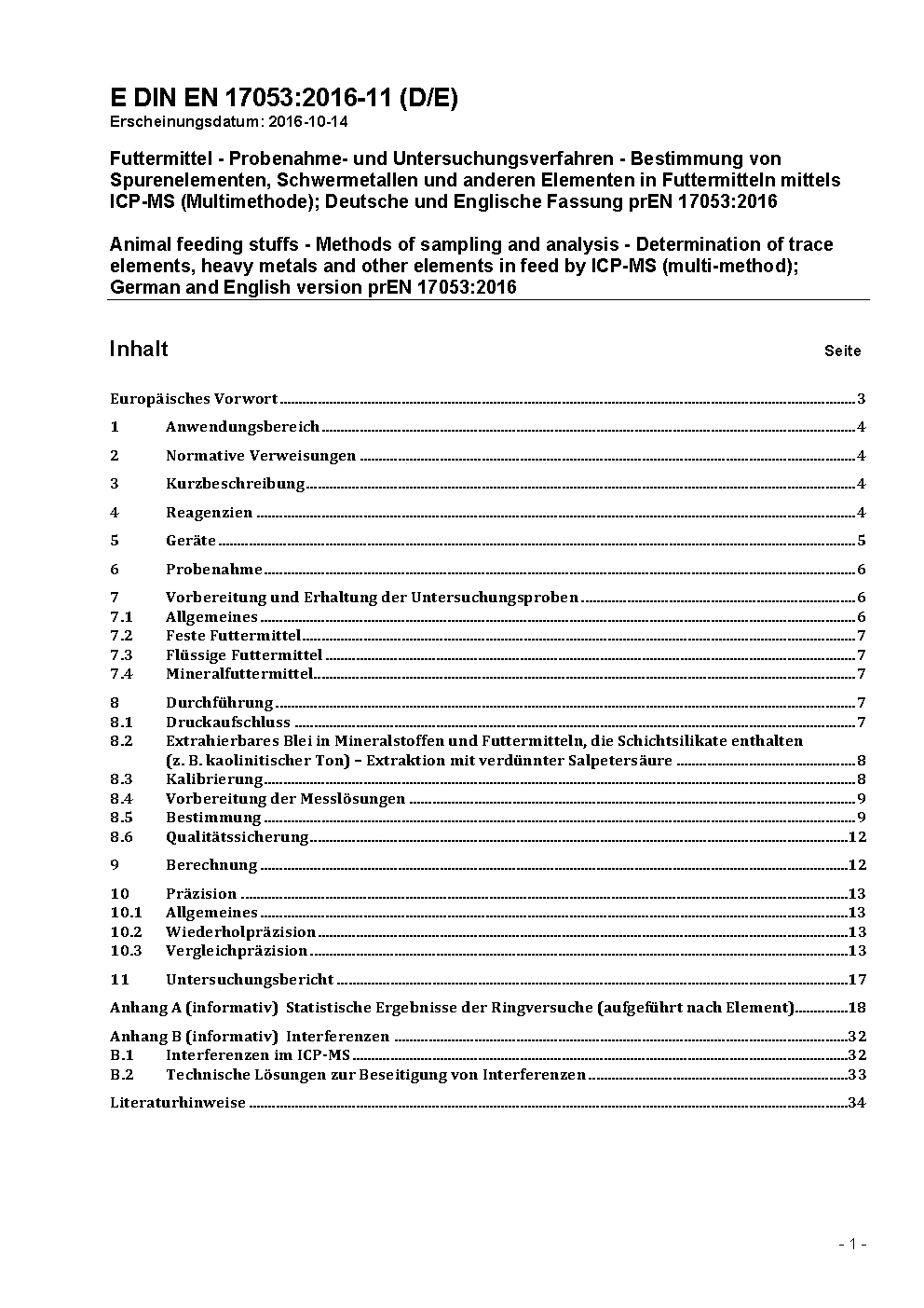 Futtermittel - Probenahme- und Untersuchungsverfahren - Bestimmung von Spurenelementen, Schwermetallen und anderen Elementen in Futtermitteln mittels ICP-MS (Multimethode); Deutsche und Englische Fassung prEN 17053:2016