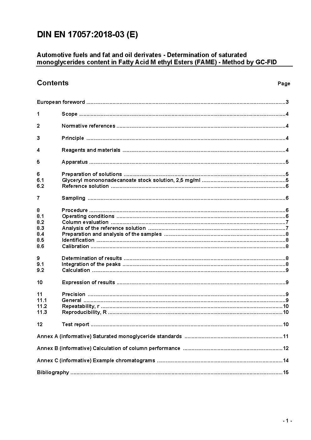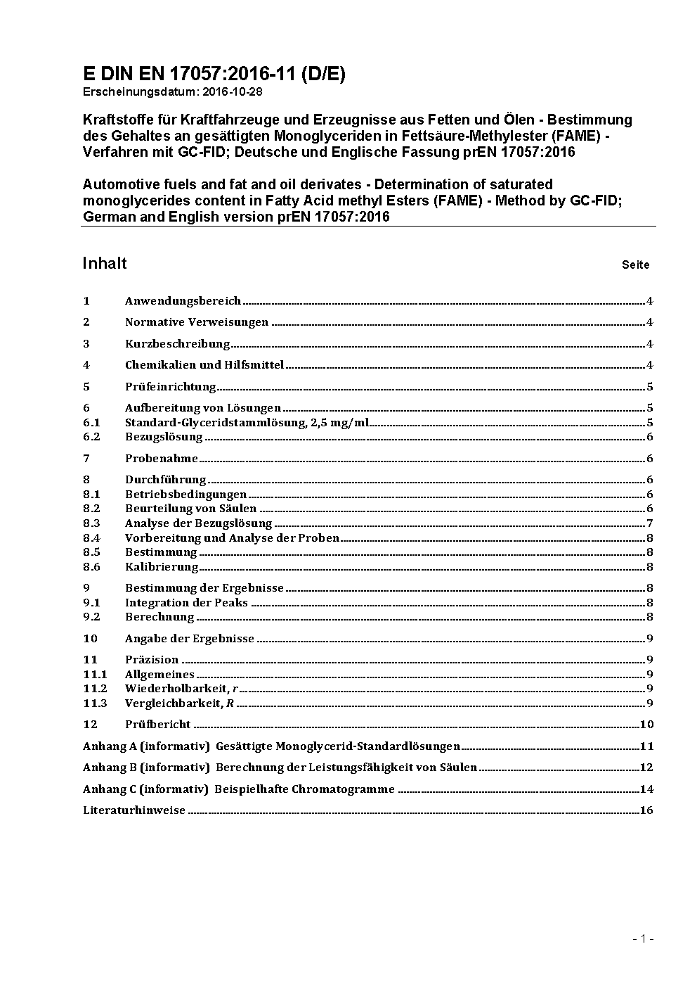 Kraftstoffe für Kraftfahrzeuge und Erzeugnisse aus Fetten und Ölen - Bestimmung des Gehaltes an gesättigten Monoglyceriden in Fettsäure-Methylester (FAME) - Verfahren mit GC-FID; Deutsche und Englische Fassung prEN 17057:2016