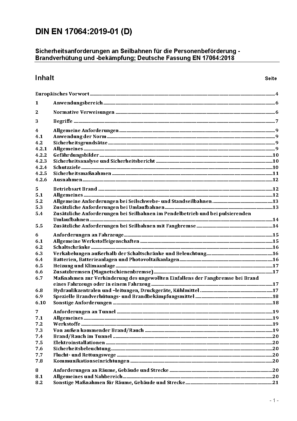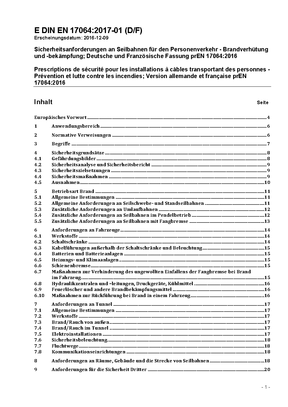 Sicherheitsanforderungen an Seilbahnen für den Personenverkehr - Brandverhütung und -bekämpfung; Deutsche und Französische Fassung prEN 17064:2016