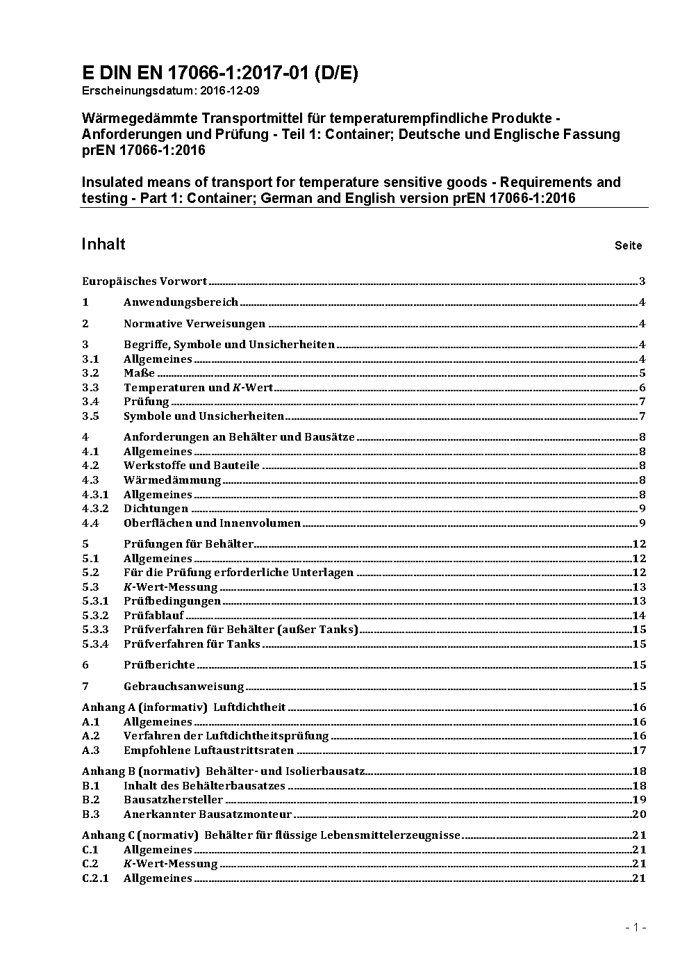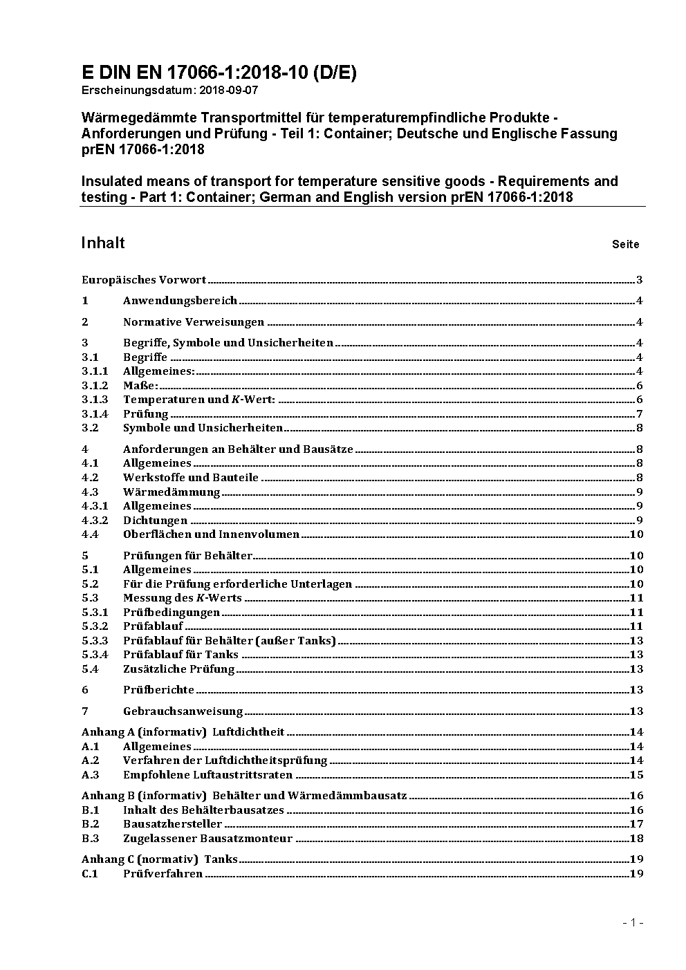 Wärmegedämmte Transportmittel für temperaturempfindliche Produkte - Anforderungen und Prüfung - Teil 1: Container; Deutsche und Englische Fassung prEN 17066-1:2018