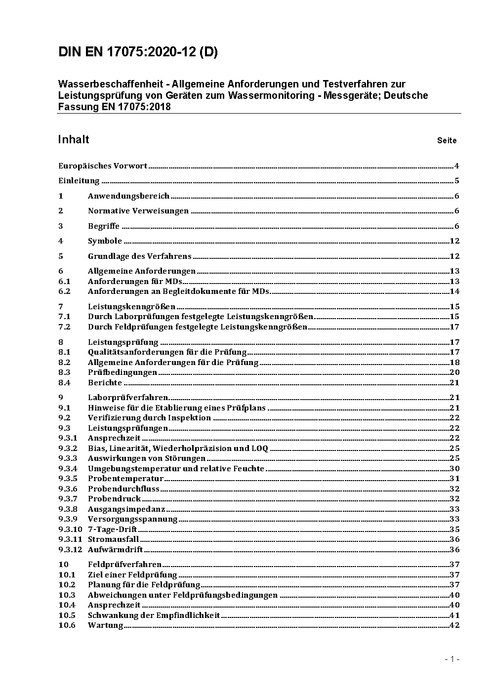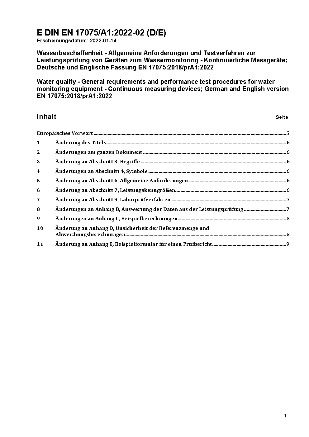 Water quality - General requirements and Performance test procedures for water monitoring equipment - Measuring devices; German and English version prEN 17075:2017