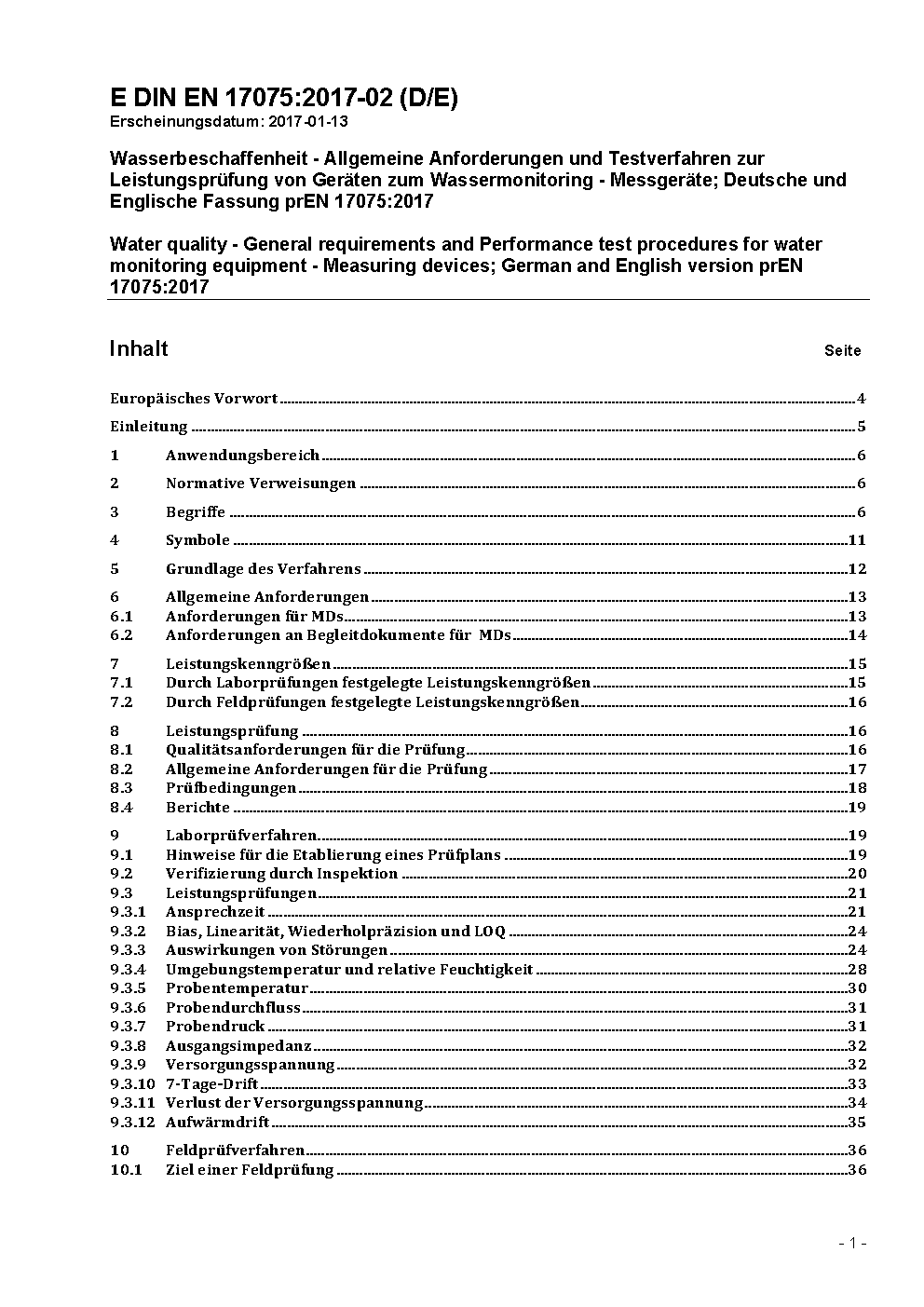 Wasserbeschaffenheit - Allgemeine Anforderungen und Testverfahren zur Leistungsprüfung von Geräten zum Wassermonitoring - Messgeräte; Deutsche und Englische Fassung prEN 17075:2017
