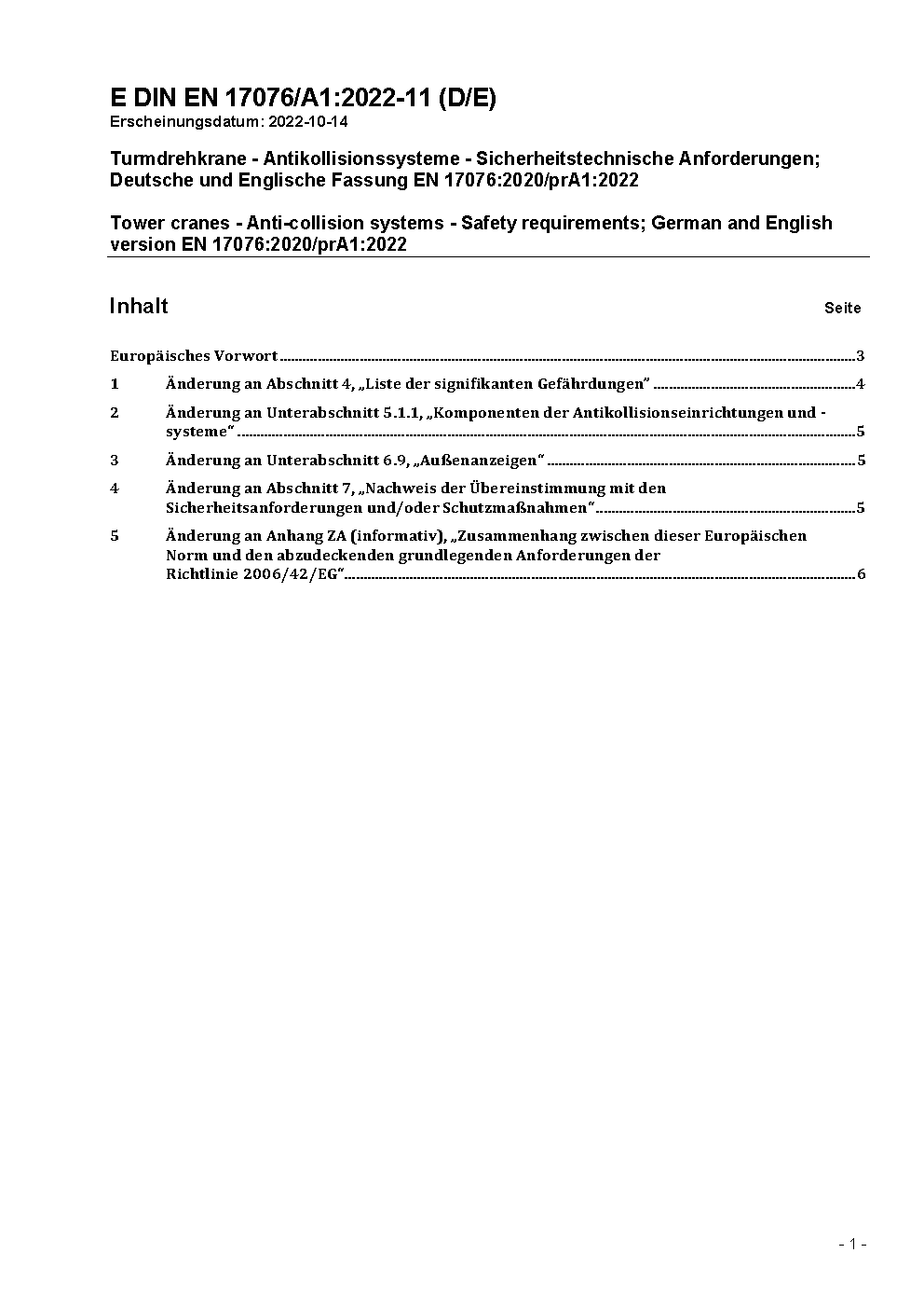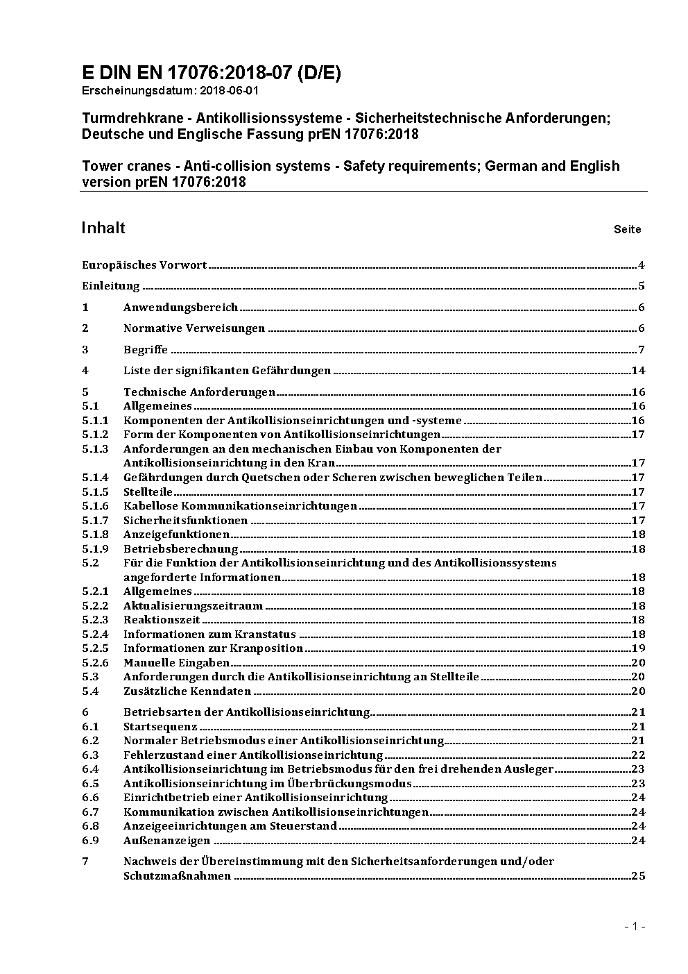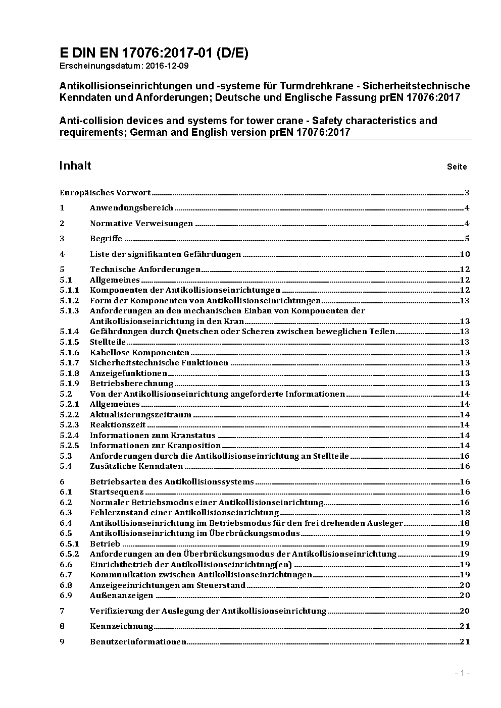 Antikollisionseinrichtungen und -systeme für Turmdrehkrane - Sicherheitstechnische Kenndaten und Anforderungen; Deutsche und Englische Fassung prEN 17076:2017