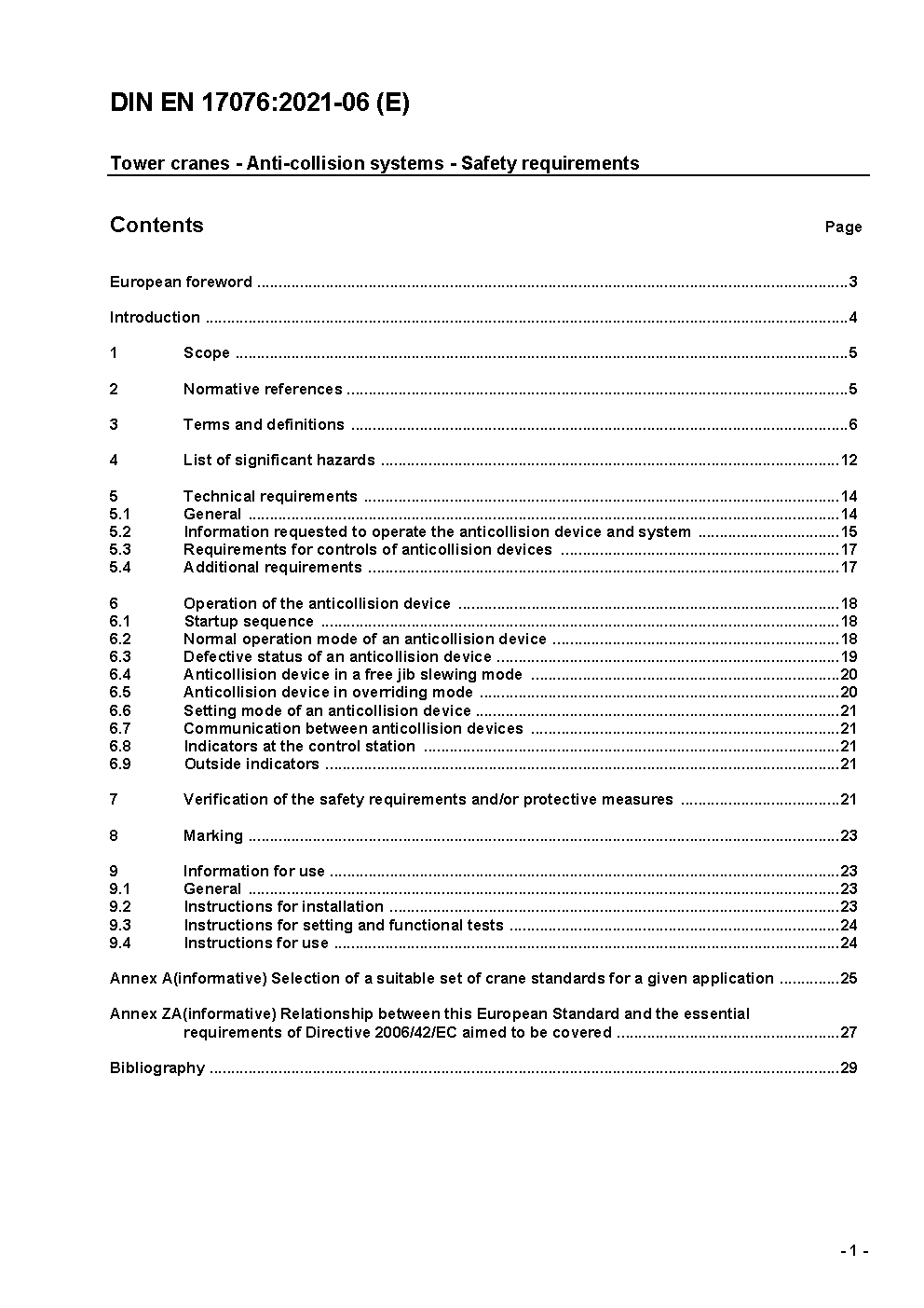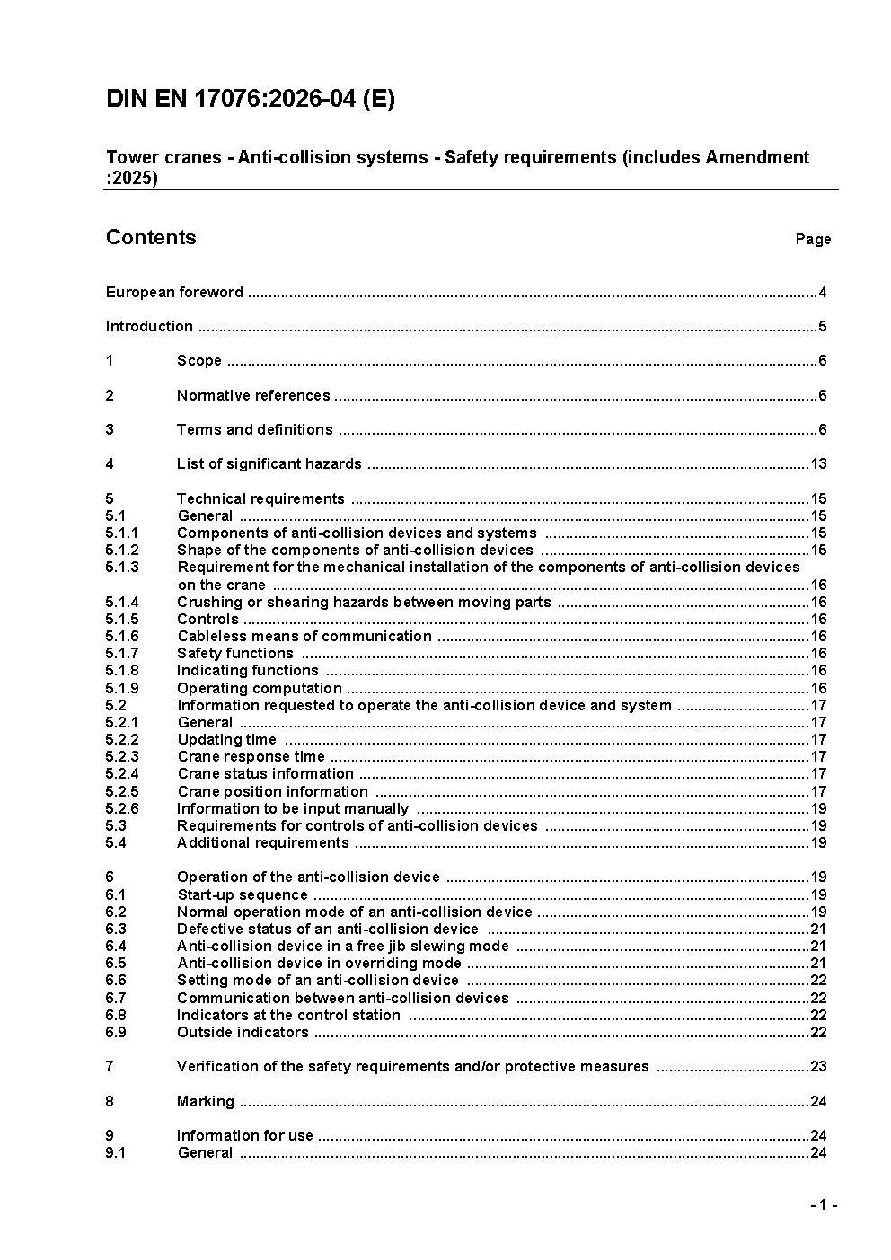 Anti-collision devices and systems for tower crane - Safety characteristics and requirements; German and English version prEN 17076:2017