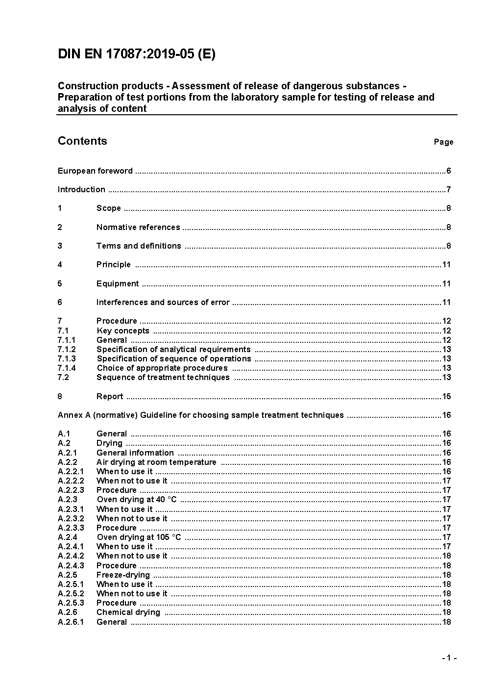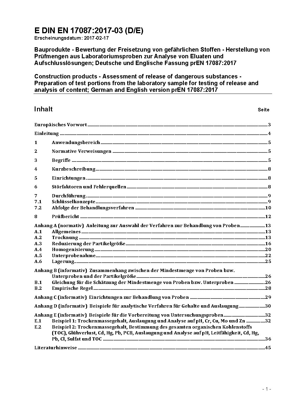 Bauprodukte - Bewertung der Freisetzung von gefährlichen Stoffen - Herstellung von Prüfmengen aus der Laborprobe zur Prüfung der Freisetzung und zur Gehaltsanalyse; Deutsche Fassung EN 17087:2019