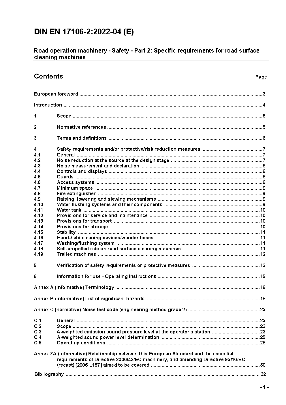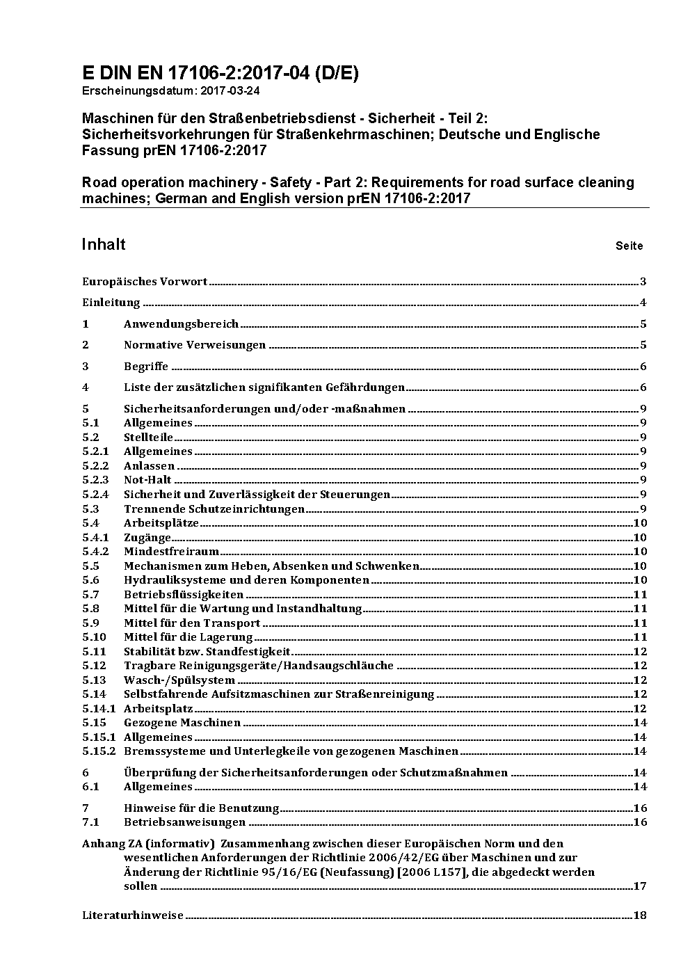 Maschinen für den Straßenbetriebsdienst - Sicherheit - Teil 2: Sicherheitsvorkehrungen für Straßenkehrmaschinen; Deutsche und Englische Fassung prEN 17106-2:2017