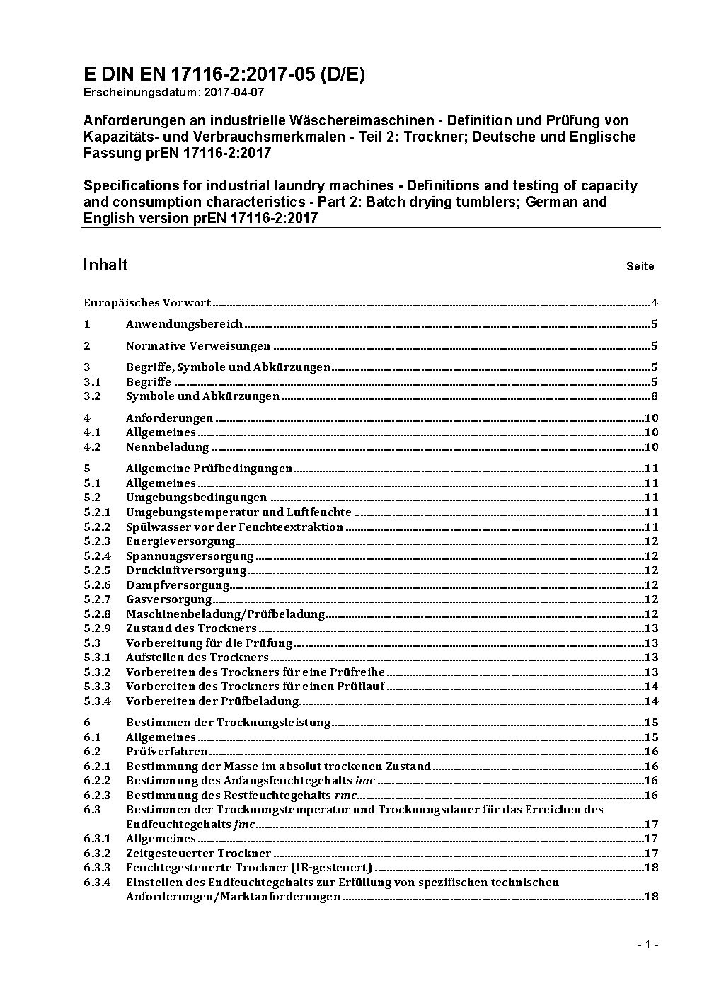 Specifications for industrial laundry machines - Definitions and testing of capacity and consumption characteristics - Part 2: Batch drying tumblers; German and English version prEN 17116-2:2017