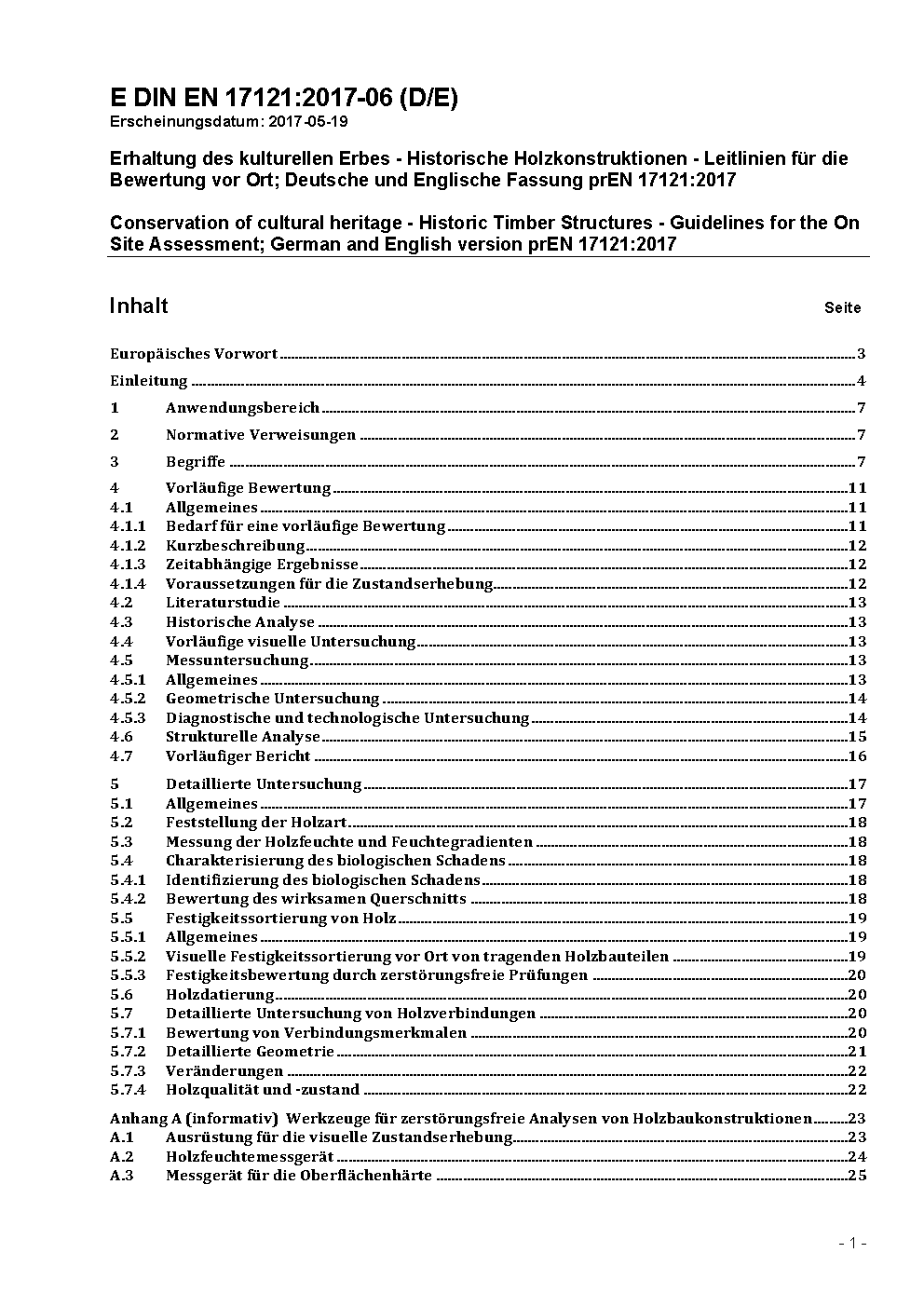 Erhaltung des kulturellen Erbes - Historische Holzkonstruktionen - Leitlinien für die Bewertung vor Ort; Deutsche und Englische Fassung prEN 17121:2017