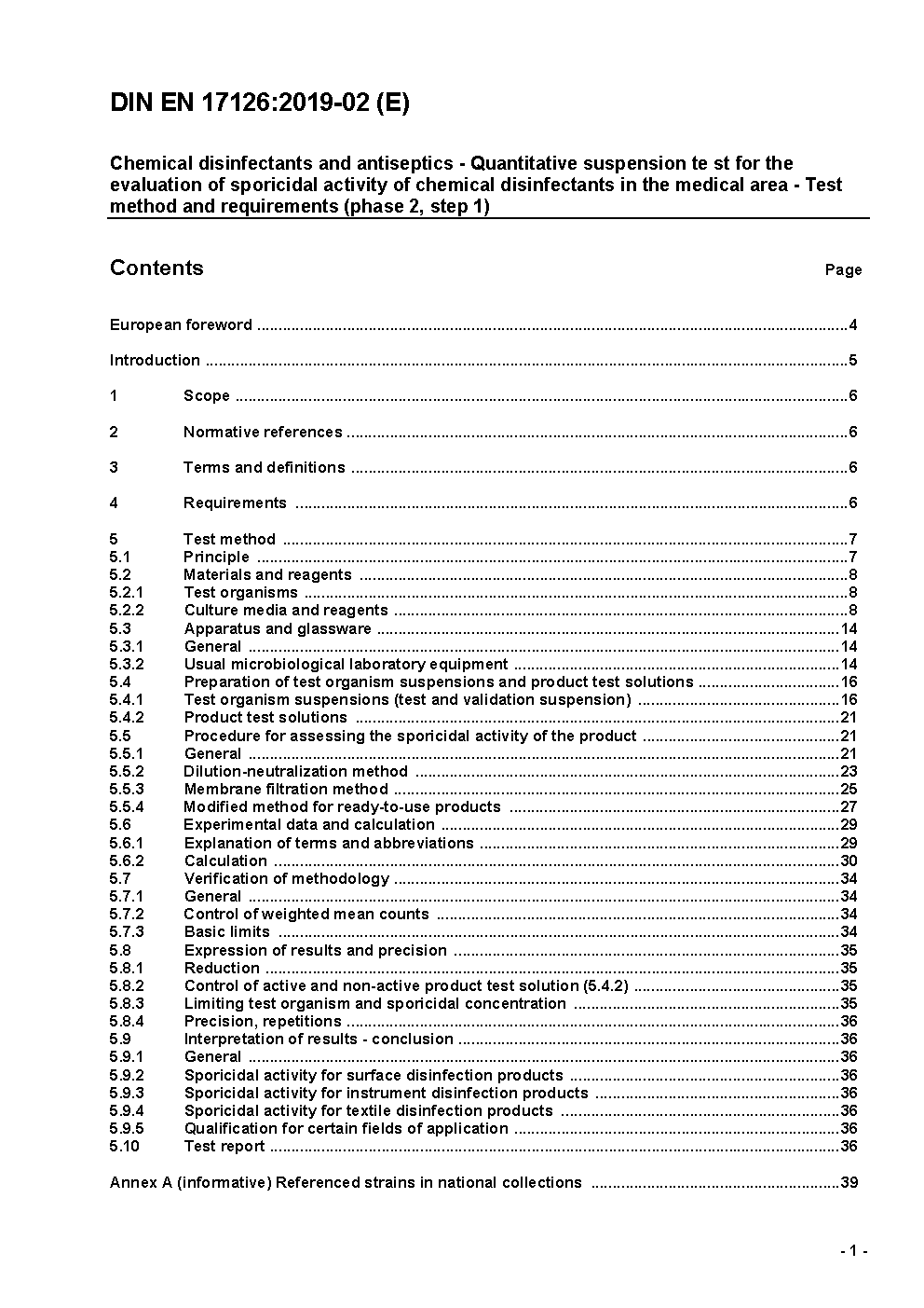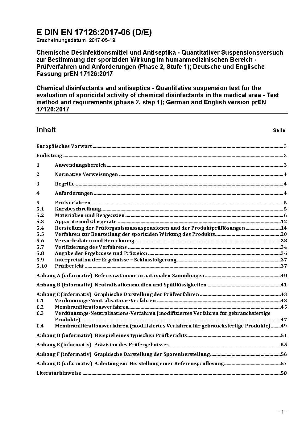 Chemische Desinfektionsmittel und Antiseptika - Quantitativer Suspensionsversuch zur Bestimmung der sporiziden Wirkung im humanmedizinischen Bereich - Prüfverfahren und Anforderungen (Phase 2, Stufe 1); Deutsche Fassung EN 17126:2018