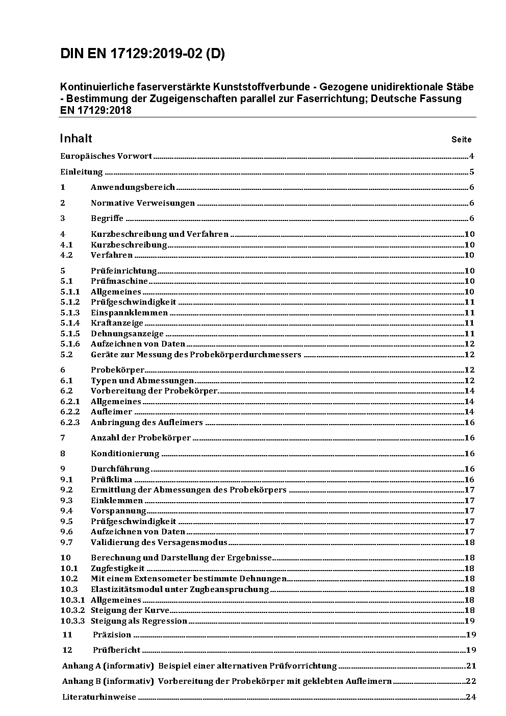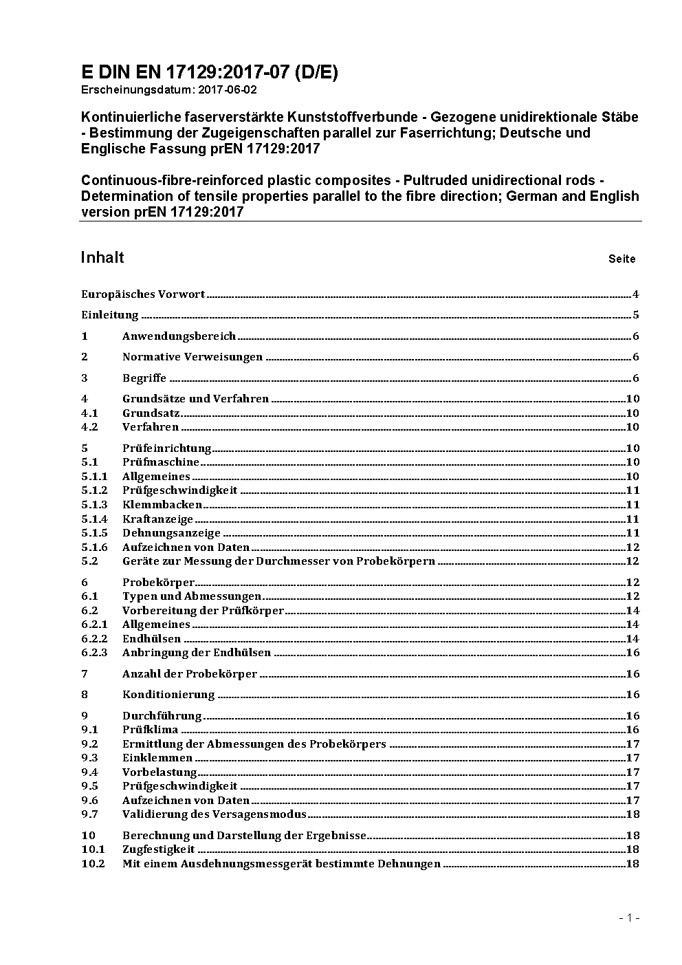 Kontinuierliche faserverstärkte Kunststoffverbunde - Gezogene unidirektionale Stäbe - Bestimmung der Zugeigenschaften parallel zur Faserrichtung; Deutsche und Englische Fassung prEN 17129:2017
