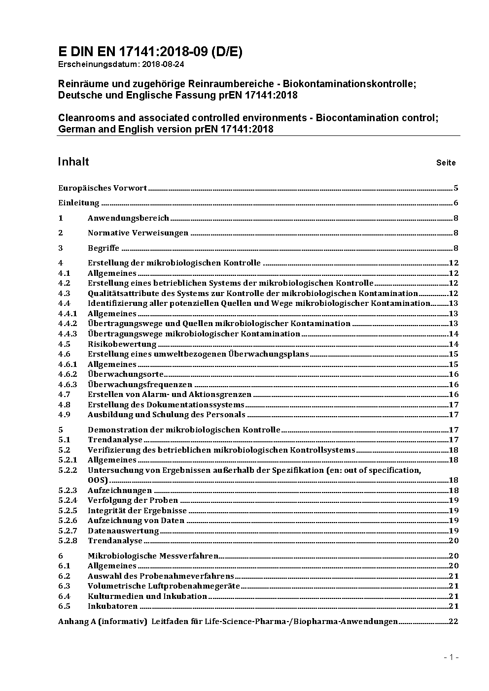 Reinräume und zugehörige Reinraumbereiche - Biokontaminationskontrolle; Deutsche und Englische Fassung prEN 17141:2017