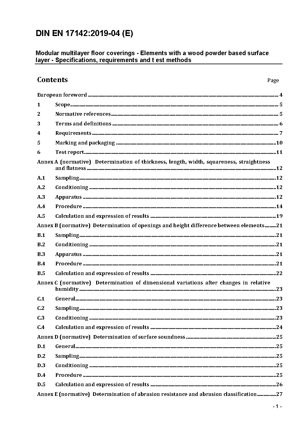 Modular multilayer floor coverings - Elements with a wood powder based surface layer - Specifications, requirements and test methods; German version EN 17142:2018