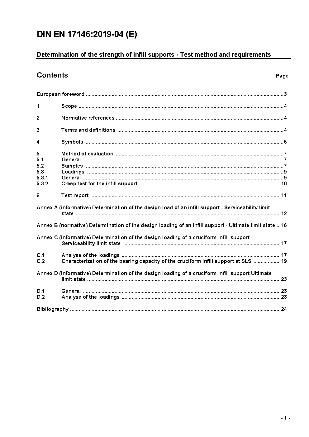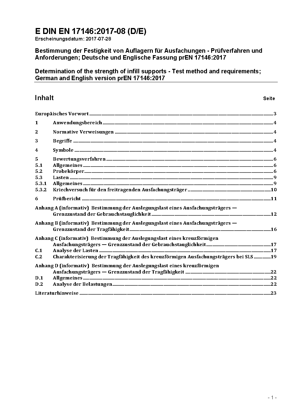 Determination of the strength of infill supports - Test method and requirements; German and English version prEN 17146:2017