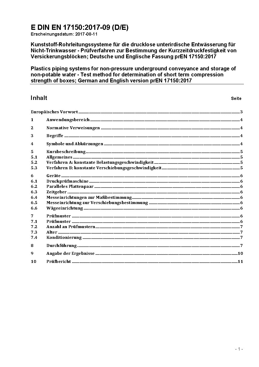 Kunststoff-Rohrleitungssysteme für die drucklose unterirdische Entwässerung für Nicht-Trinkwasser - Prüfverfahren zur Bestimmung der Kurzzeitdruckfestigkeit von Versickerungsblöcken; Deutsche und Englische Fassung prEN 17150:2017
