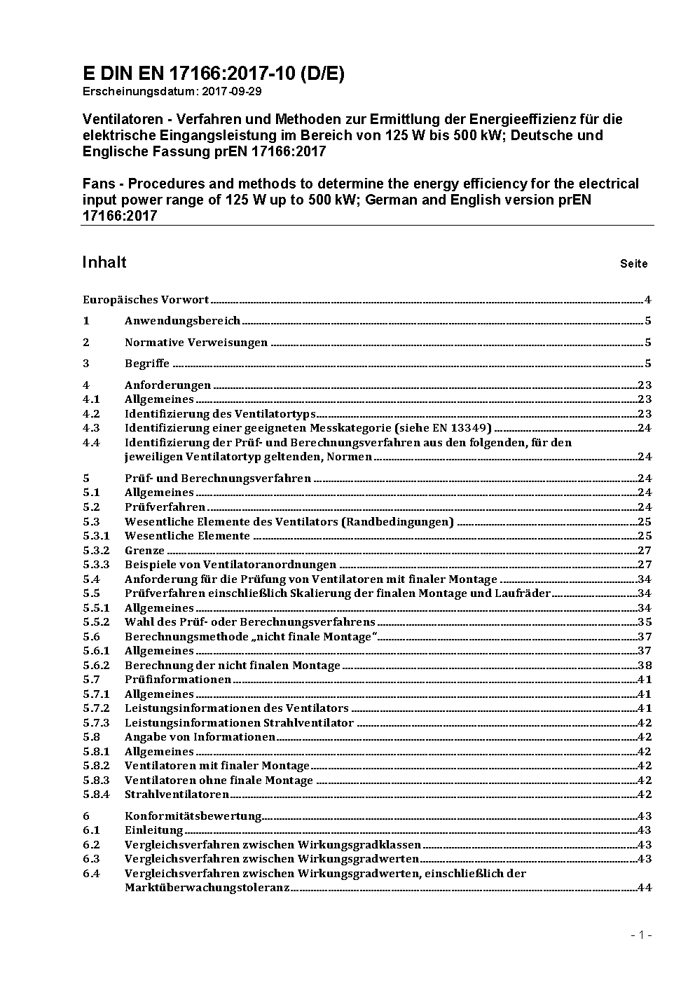 Ventilatoren - Verfahren und Methoden zur Ermittlung der Energieeffizienz für die elektrische Eingangsleistung im Bereich von 125 W bis 500 kW; Deutsche und Englische Fassung prEN 17166:2017