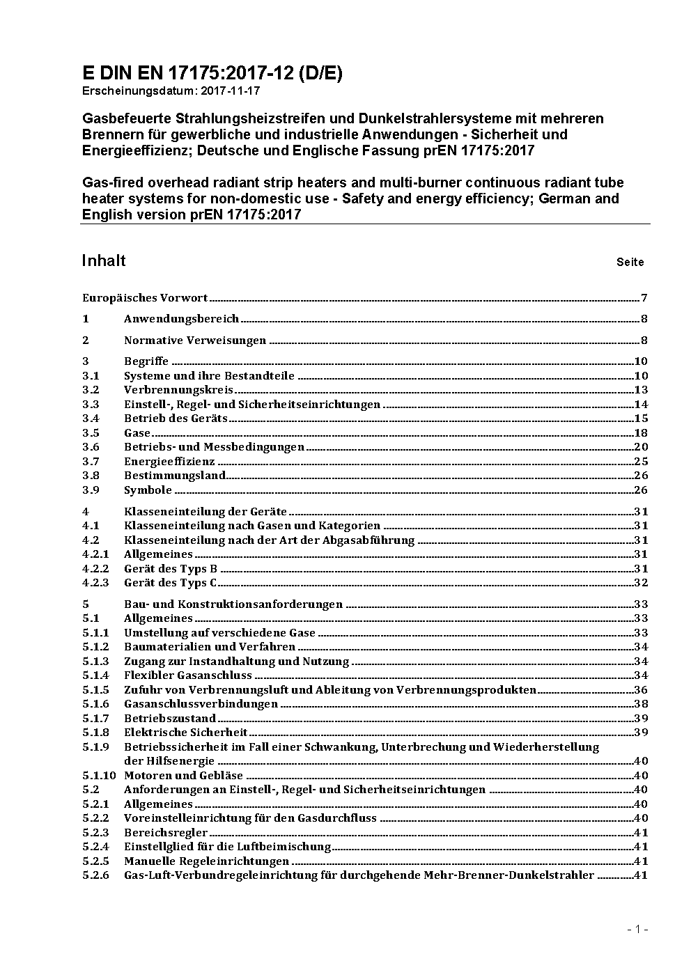 Gasbefeuerte Strahlungsheizstreifen und Dunkelstrahlersysteme mit mehreren Brennern für gewerbliche und industrielle Anwendungen - Sicherheit und Energieeffizienz; Deutsche und Englische Fassung prEN 17175:2017