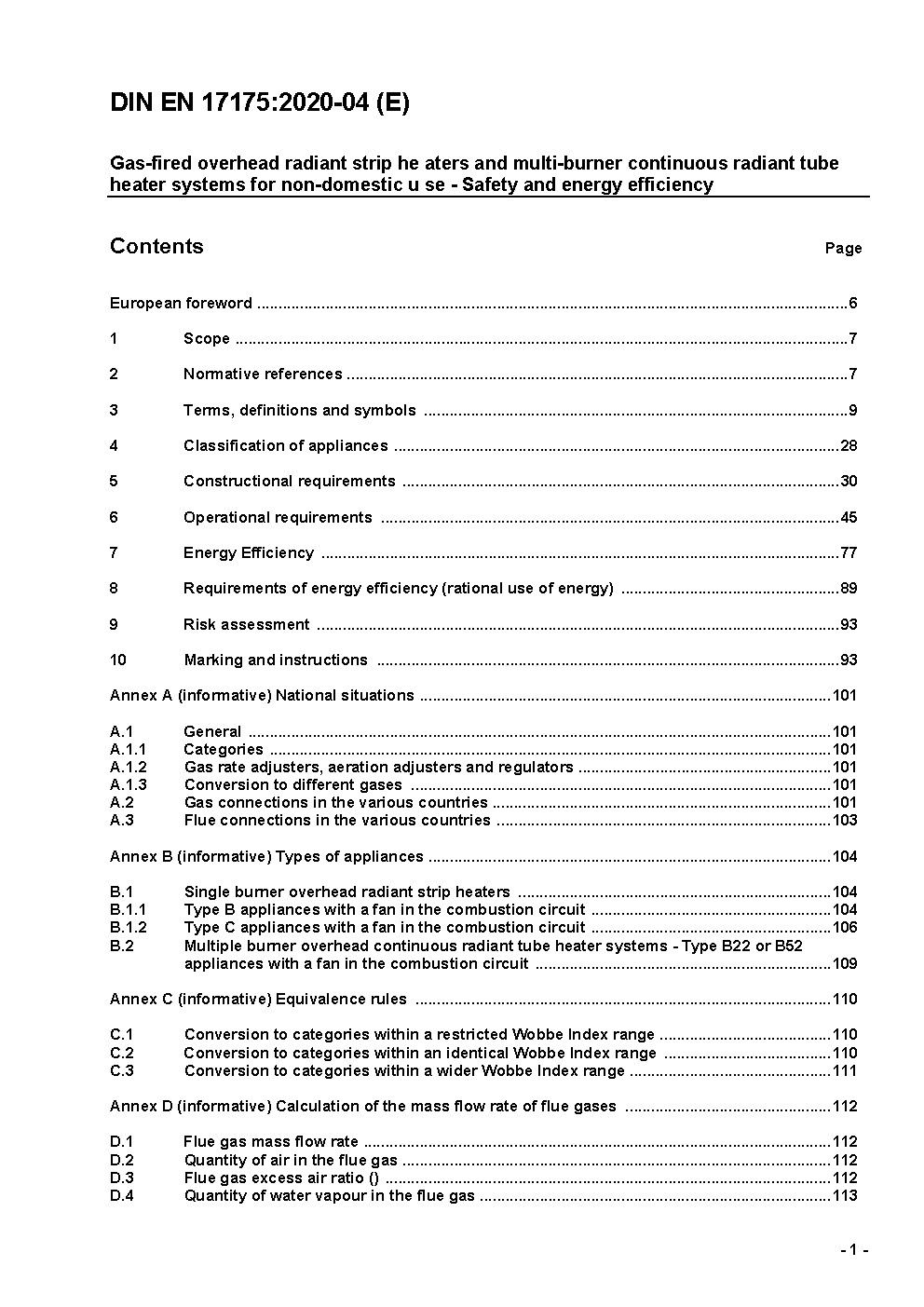 Gas-fired overhead radiant strip heaters and multi-burner continuous radiant tube heater systems for non-domestic use - Safety and energy efficiency; German and English version prEN 17175:2017