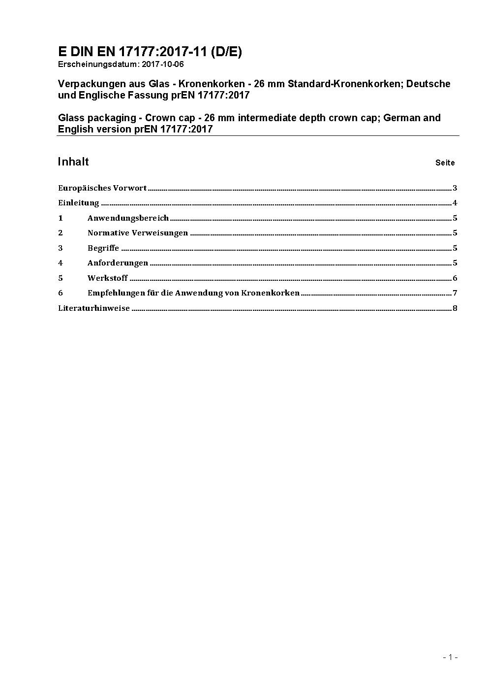 Verpackungen aus Glas - Kronenkorken - 26 mm Standard-Kronenkorken; Deutsche und Englische Fassung prEN 17177:2017