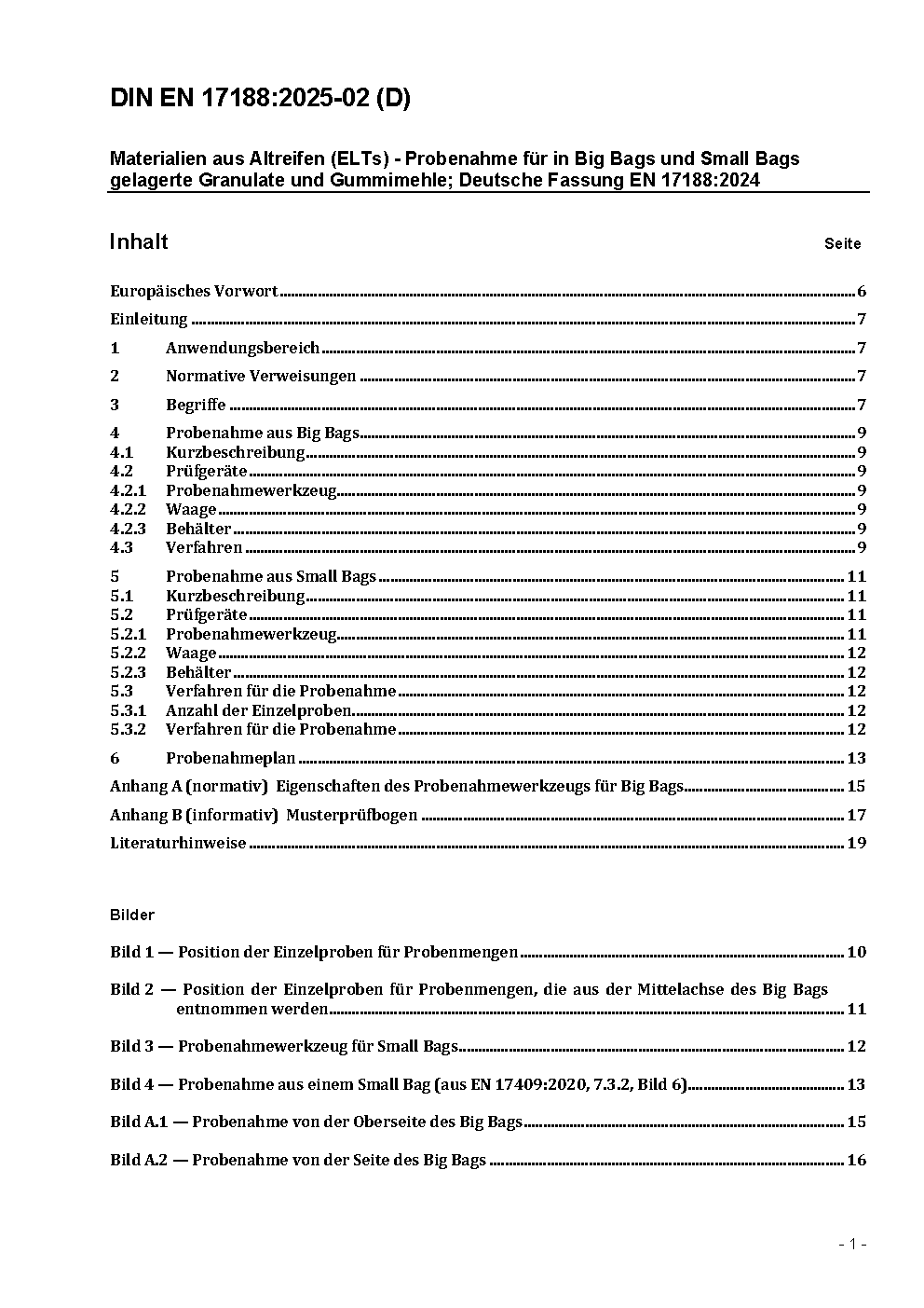 Materials obtained from end of life tyres (ELT) - Sampling method for granulates and powders stored in big-bags and small-bags; German and English version prEN 17188:2023