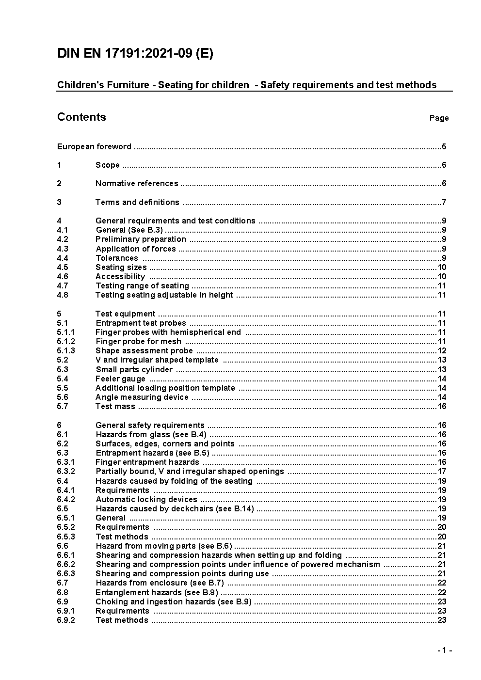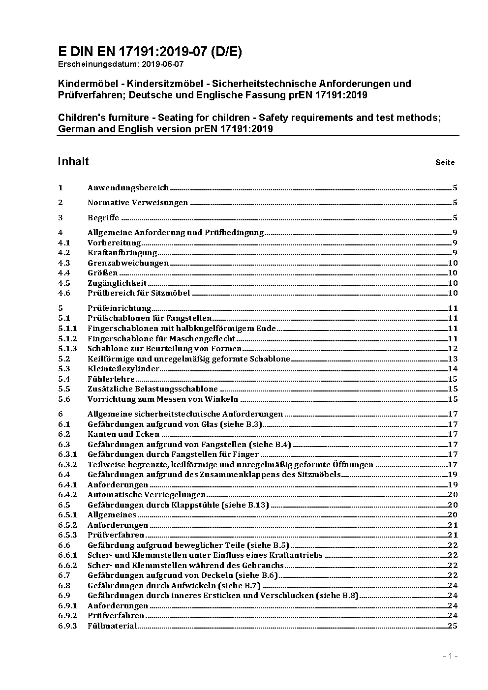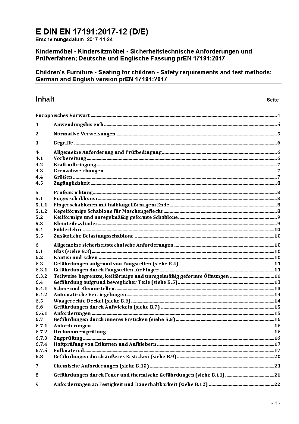 Children's Furniture - Seating for children - Safety requirements and test methods; German and English version prEN 17191:2017