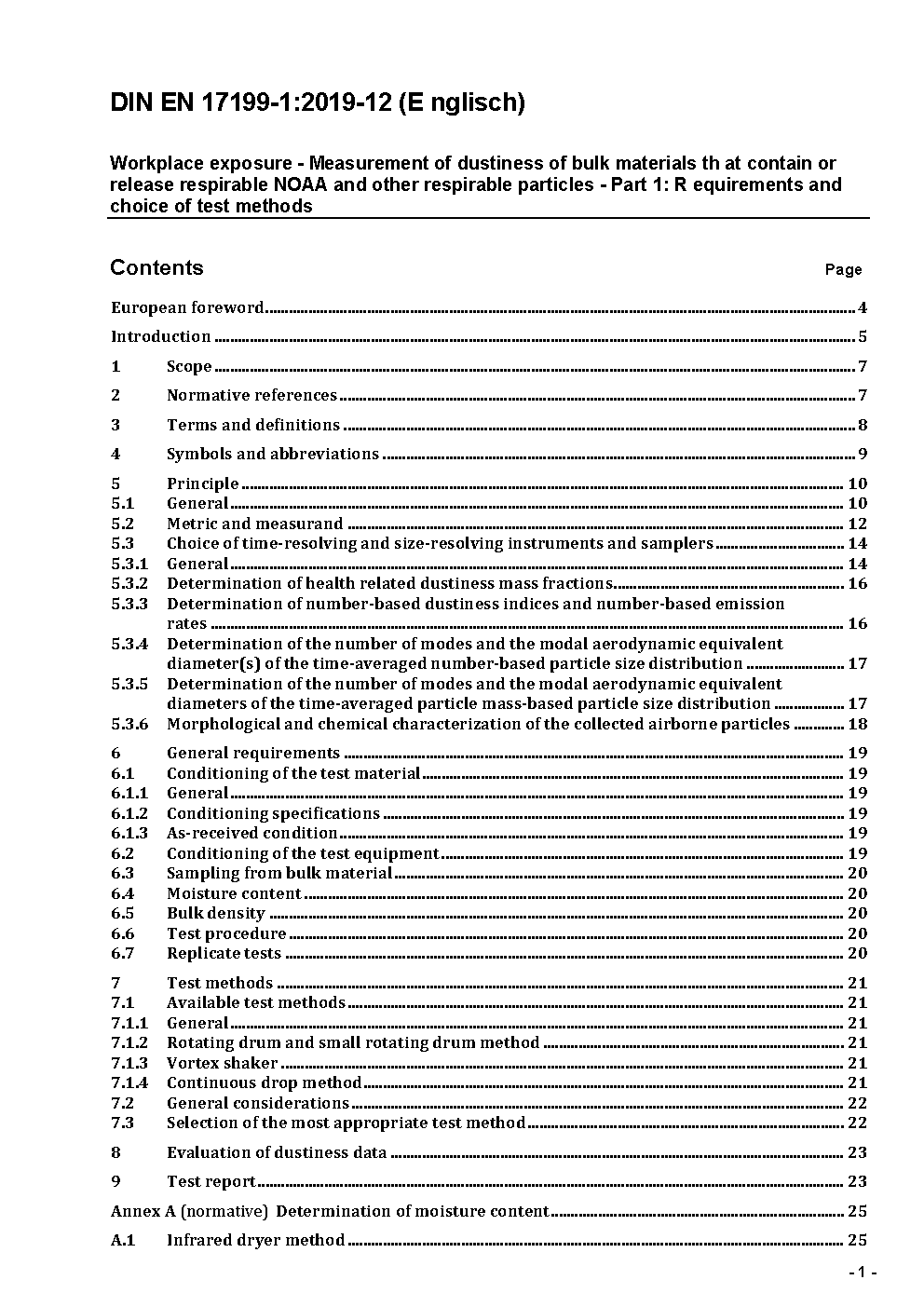 Exposition am Arbeitsplatz - Messung des Staubungsverhaltens von Schüttgütern, die Nanoobjekte oder Submikrometerpartikel enthalten oder freisetzen - Teil 1: Anforderungen und Auswahl des Prüfverfahrens; Deutsche und Englische Fassung prEN 17199-1:2018
