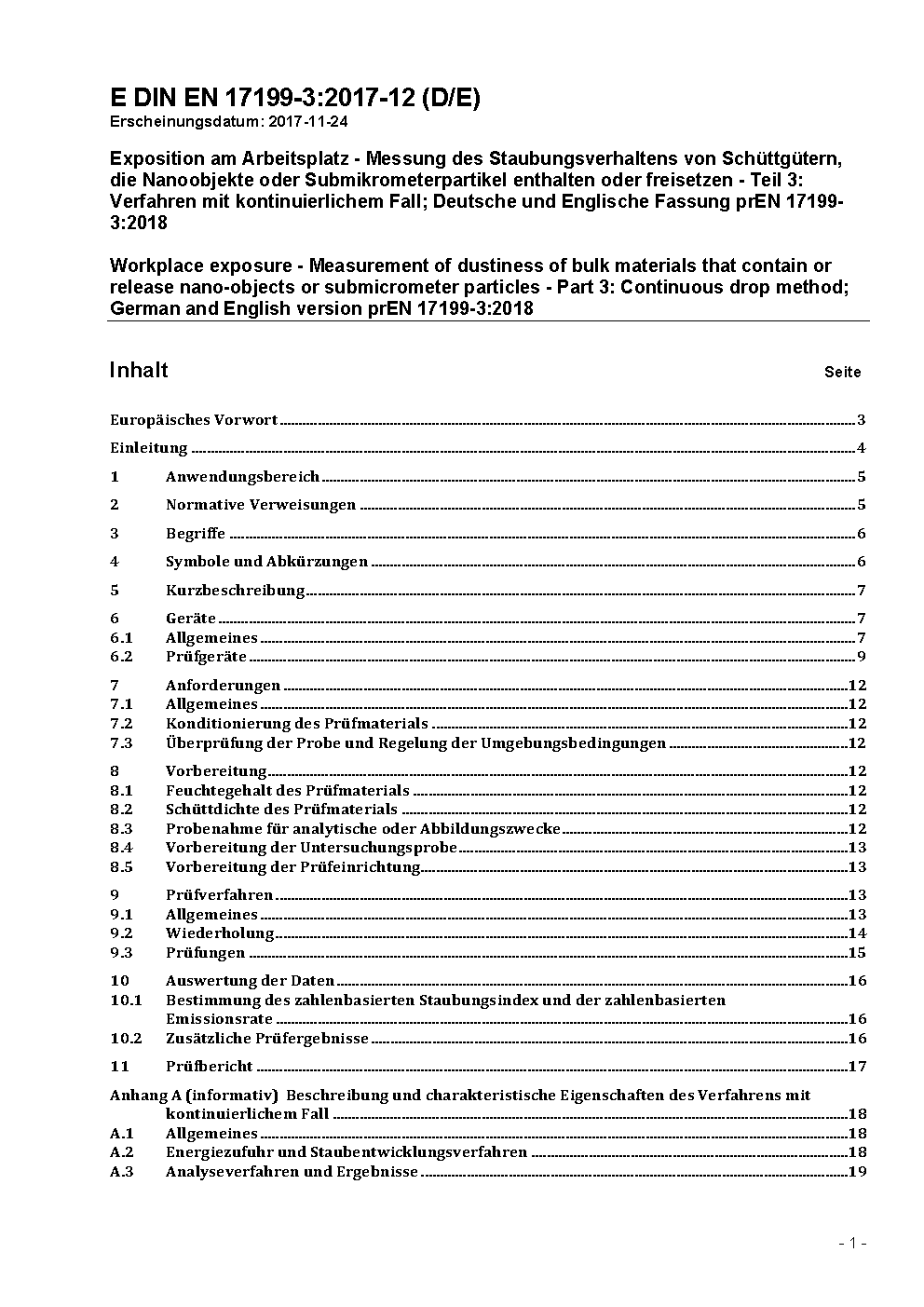Exposition am Arbeitsplatz - Messung des Staubungsverhaltens von Schüttgütern, die alveolengängige NOAA oder andere alveolengängige Partikel enthalten oder freisetzen - Teil 3: Verfahren mit kontinuierlichem Fall; Deutsche Fassung EN 17199-3:2019