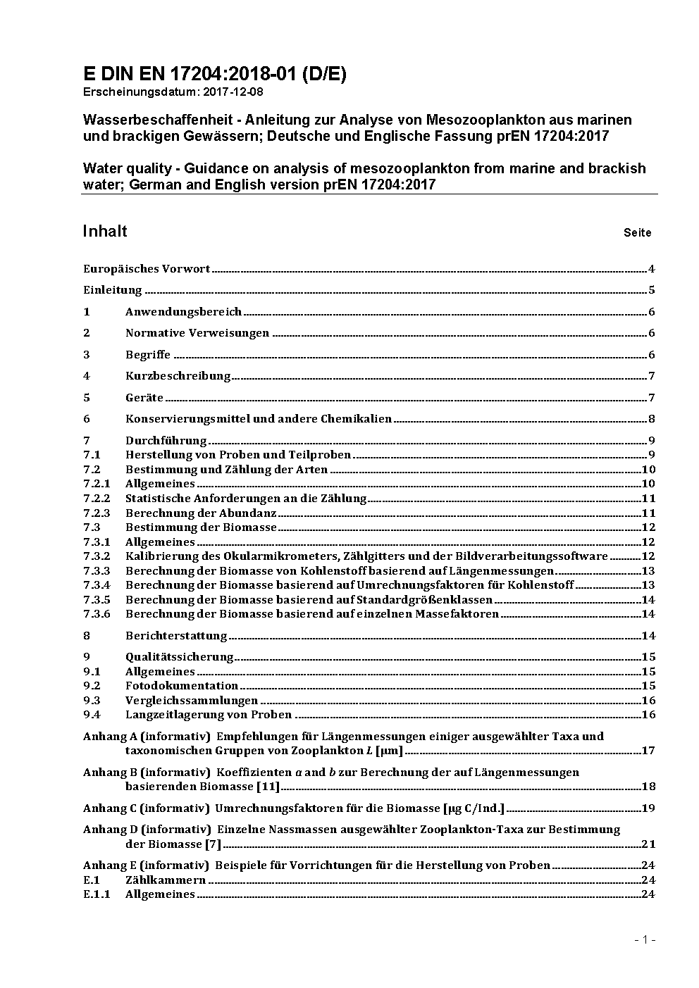 Wasserbeschaffenheit - Anleitung zur Analyse von Mesozooplankton aus marinen und brackigen Gewässern; Deutsche und Englische Fassung prEN 17204:2017