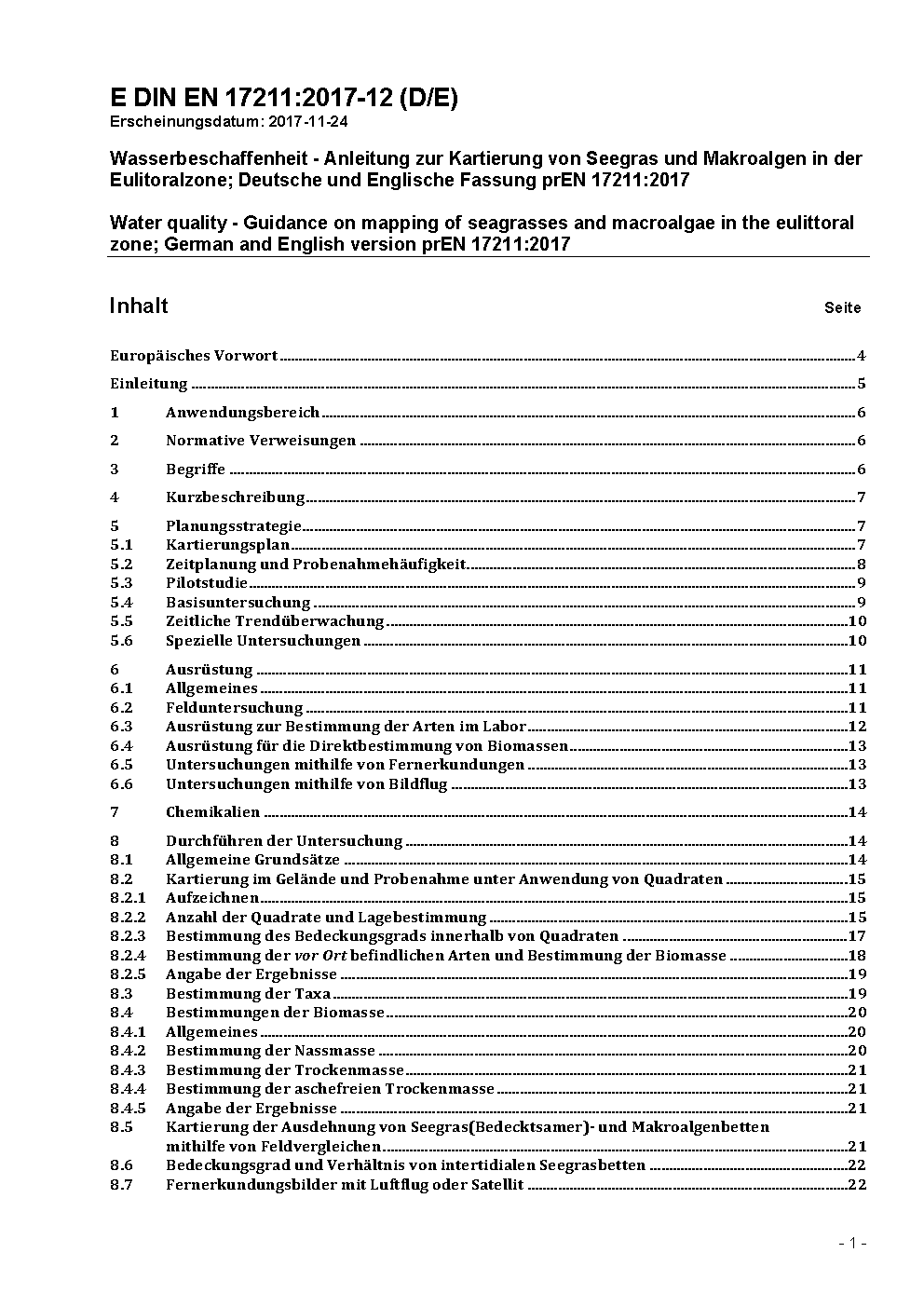 Wasserbeschaffenheit - Anleitung zur Kartierung von Seegras und Makroalgen in der Eulitoralzone; Deutsche und Englische Fassung prEN 17211:2017