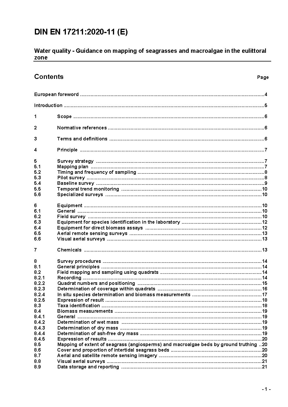 Water quality - Guidance on mapping of seagrasses and macroalgae in the eulittoral zone; German and English version prEN 17211:2017